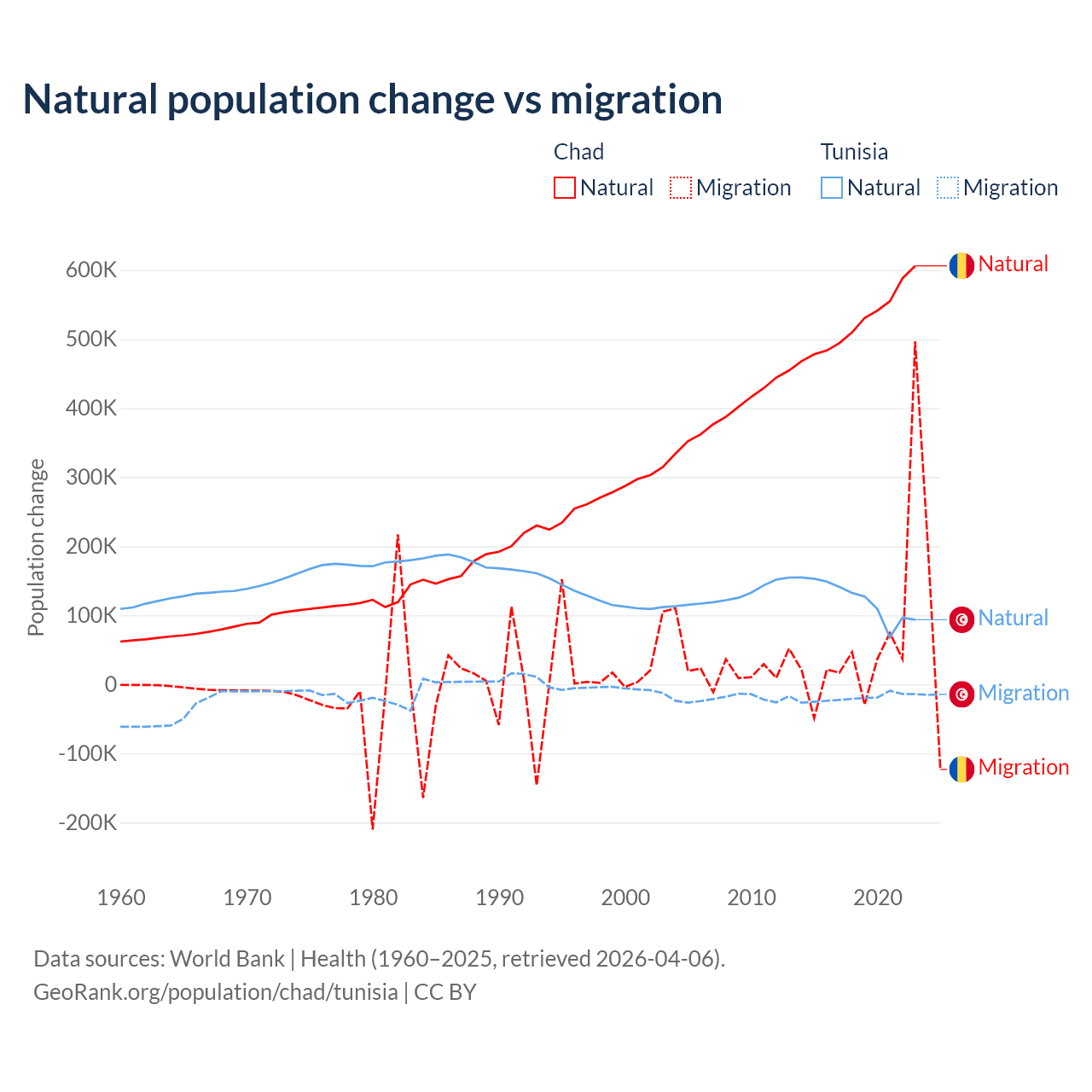 Over the last 10 years, 88.7% of the population change in Chad is from natural causes (a gain of 5,253,964 people) and 11.3% is from migration (a gain of 672,204 people). In Tunisia 86.3% is from natural causes (a gain of 1,225,079 people) and 13.7% is from migration (a loss of 195,011 people).