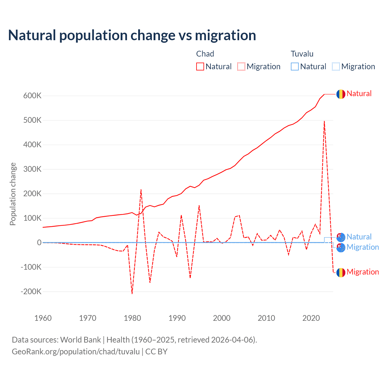 Over the last 10 years, 88.7% of the population change in Chad is from natural causes (a gain of 5,253,964 people) and 11.3% is from migration (a gain of 672,204 people). In Tuvalu 35.5% is from natural causes (a gain of 1,556 people) and 64.5% is from migration (a loss of 2,827 people).