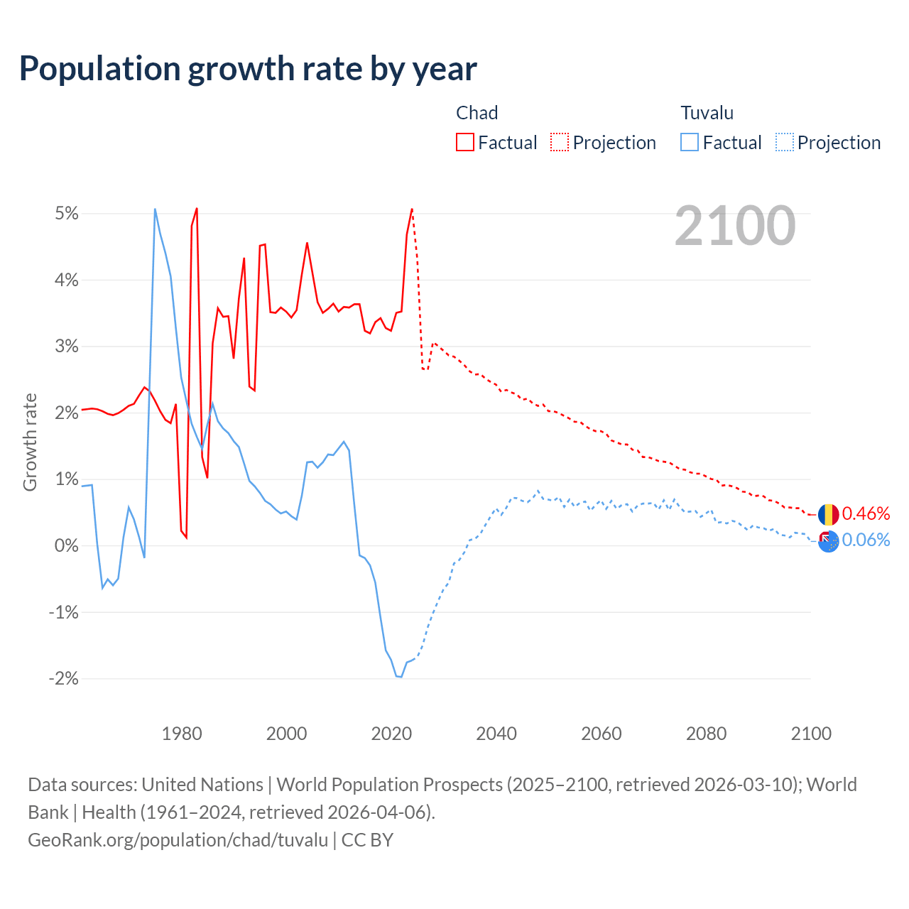 - For the last 10 years, Chad has had an average growth rate of +3.65% per year vs -1.19% in Tuvalu.