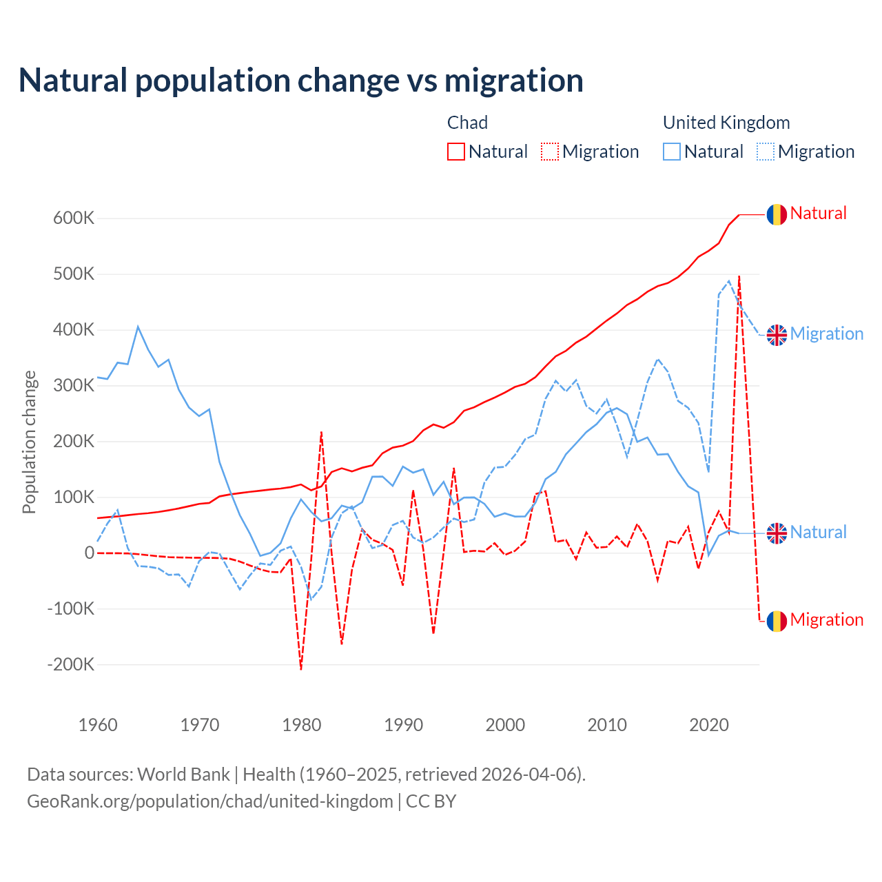 Over the last 10 years, 88.7% of the population change in Chad is from natural causes (a gain of 5,253,964 people) and 11.3% is from migration (a gain of 672,204 people). In the United Kingdom 23.9% is from natural causes (a gain of 1,033,129 people) and 76.1% is from migration (a gain of 3,283,101 people).