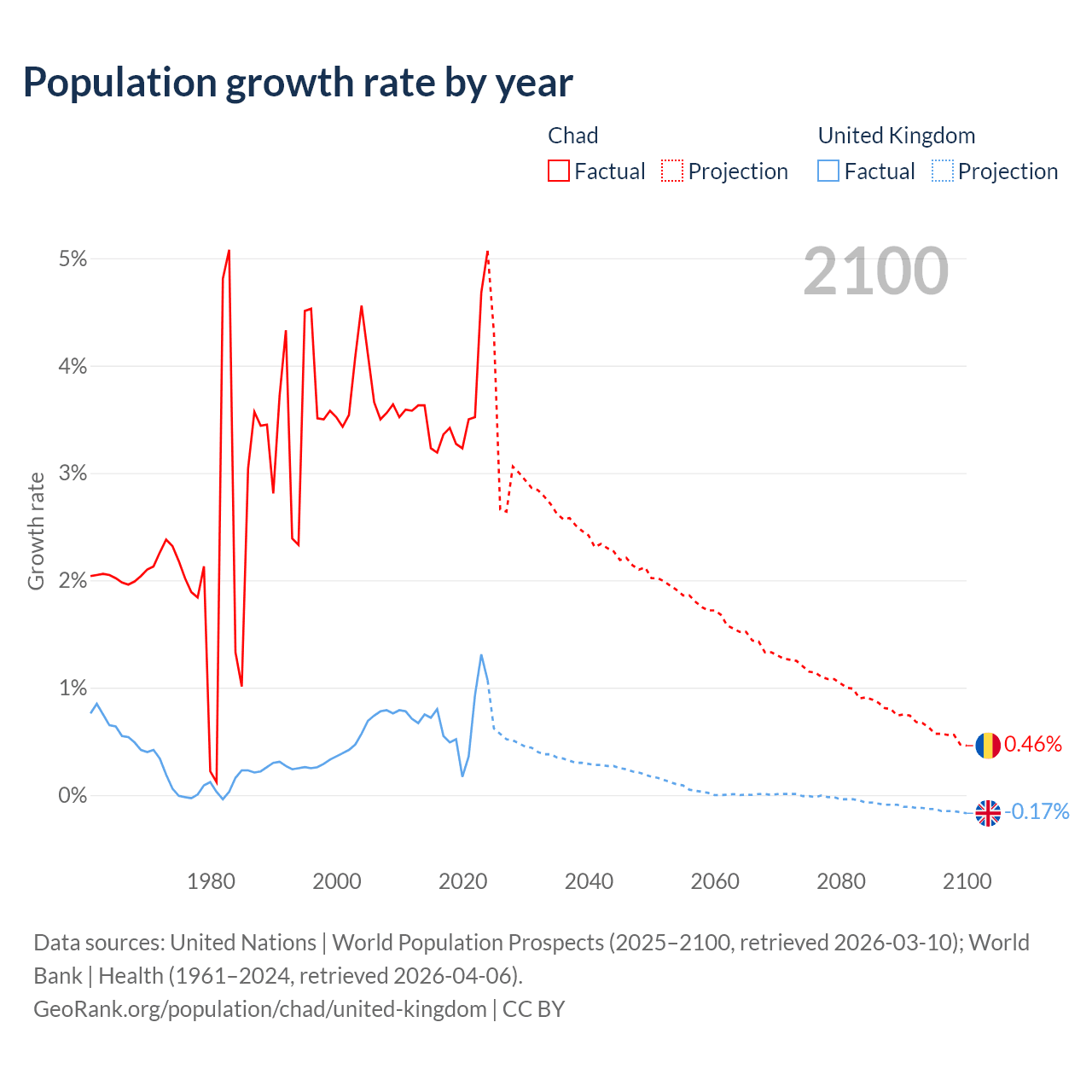 - For the last 10 years, Chad has had an average growth rate of +3.65% per year vs +0.7% in the United Kingdom.