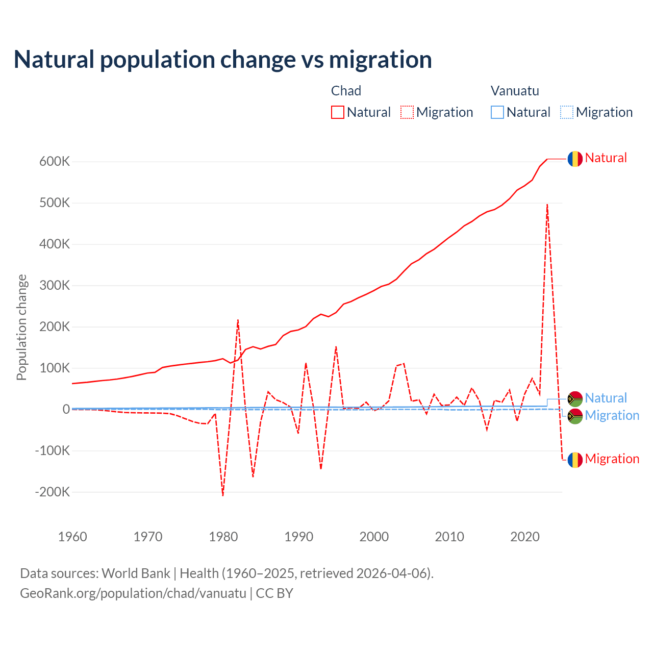 Over the last 10 years, 88.7% of the population change in Chad is from natural causes (a gain of 5,253,964 people) and 11.3% is from migration (a gain of 672,204 people). In Vanuatu 92.2% is from natural causes (a gain of 72,941 people) and 7.81% is from migration (a loss of 6,181 people).