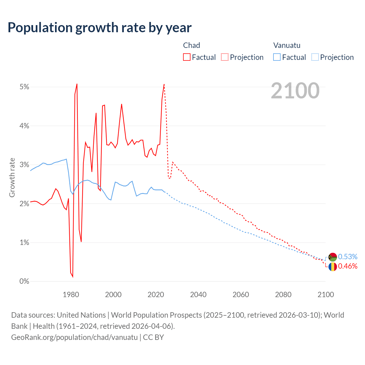 - For the last 10 years, Chad has had an average growth rate of +3.65% per year vs +2.33% in Vanuatu.