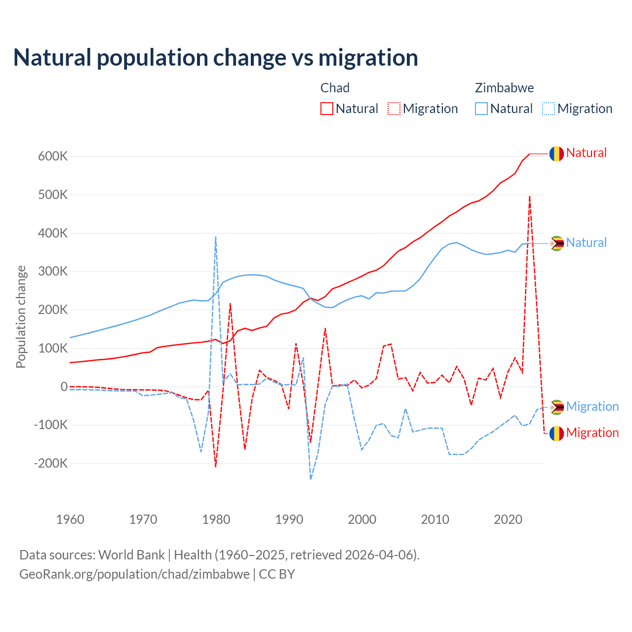 Over the last 10 years, 88.7% of the population change in Chad is from natural causes (a gain of 5,253,964 people) and 11.3% is from migration (a gain of 672,204 people). In Zimbabwe 74.9% is from natural causes (a gain of 3,558,487 people) and 25.1% is from migration (a loss of 1,192,807 people).