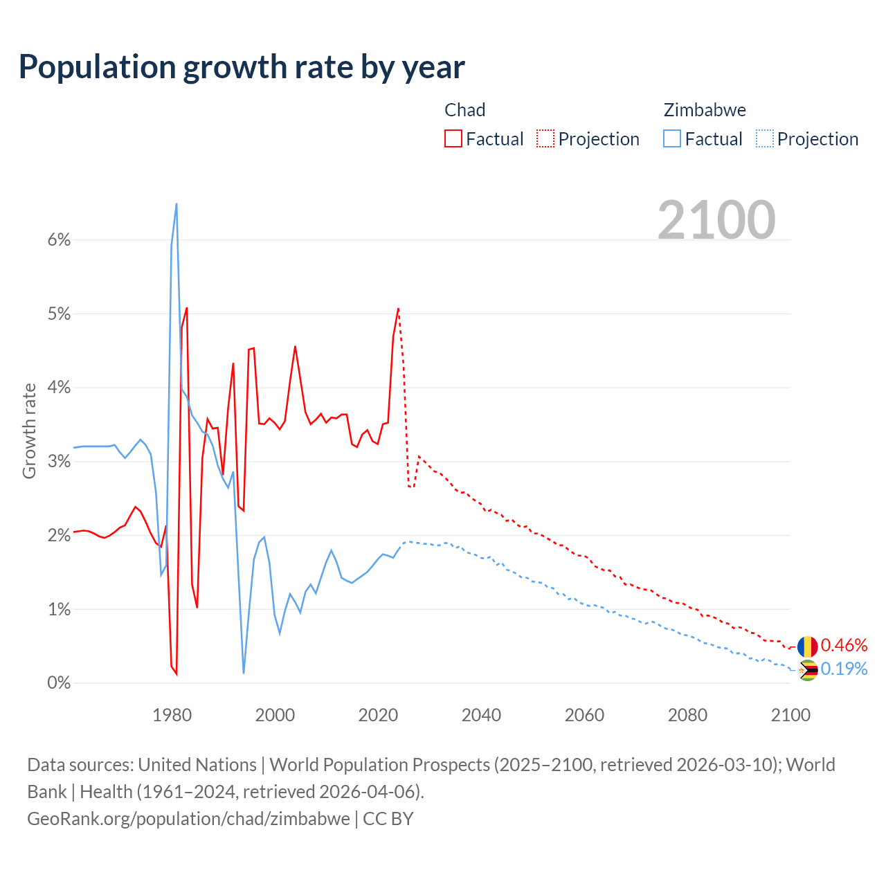 - For the last 10 years, Chad has had an average growth rate of +3.65% per year vs +1.57% in Zimbabwe.