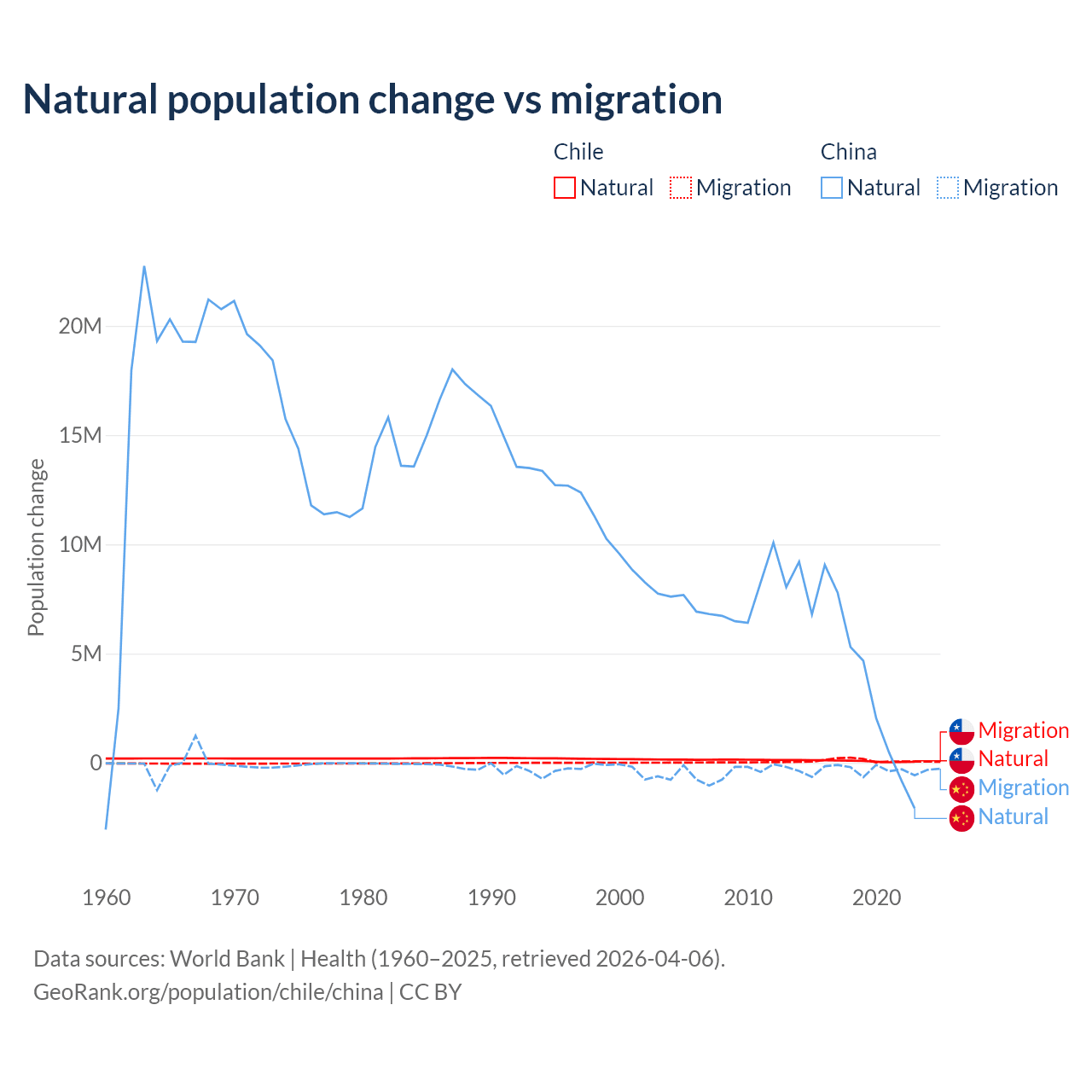 Over the last 10 years, 43.5% of the population change in Chile is from natural causes (a gain of 844,683 people) and 56.5% is from migration (a gain of 1,097,597 people). In China 92.5% is from natural causes (a gain of 42,414,528 people) and 7.53% is from migration (a loss of 3,452,923 people).