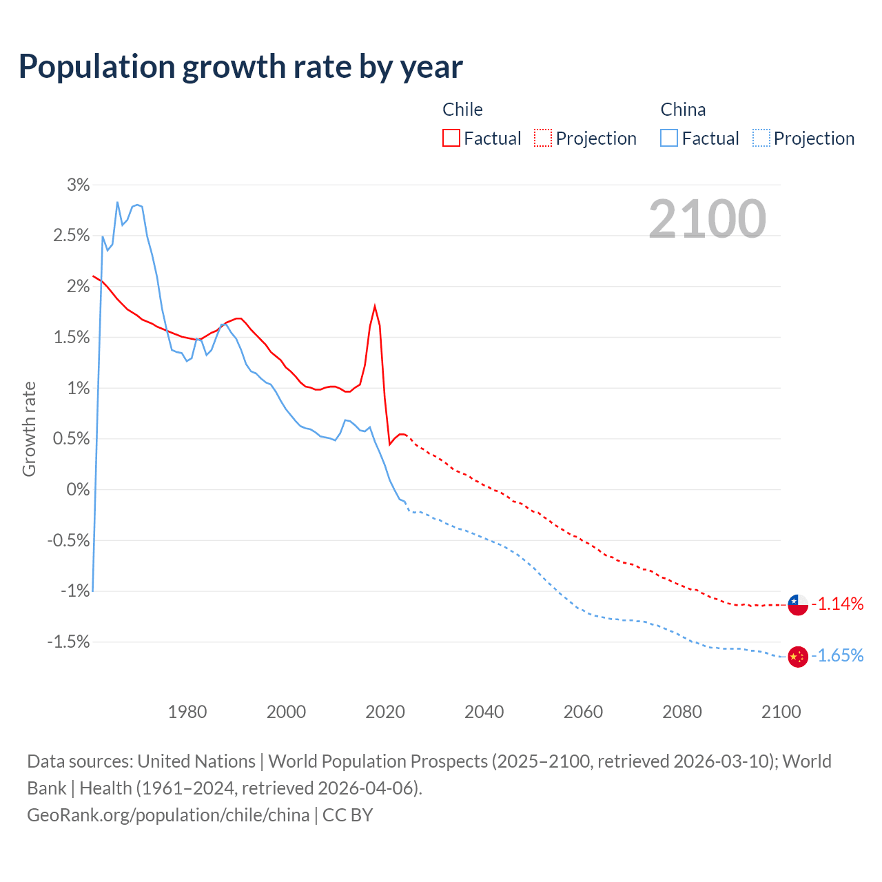 - For the last 10 years, Chile has had an average growth rate of +1.02% per year vs +0.3% in China.