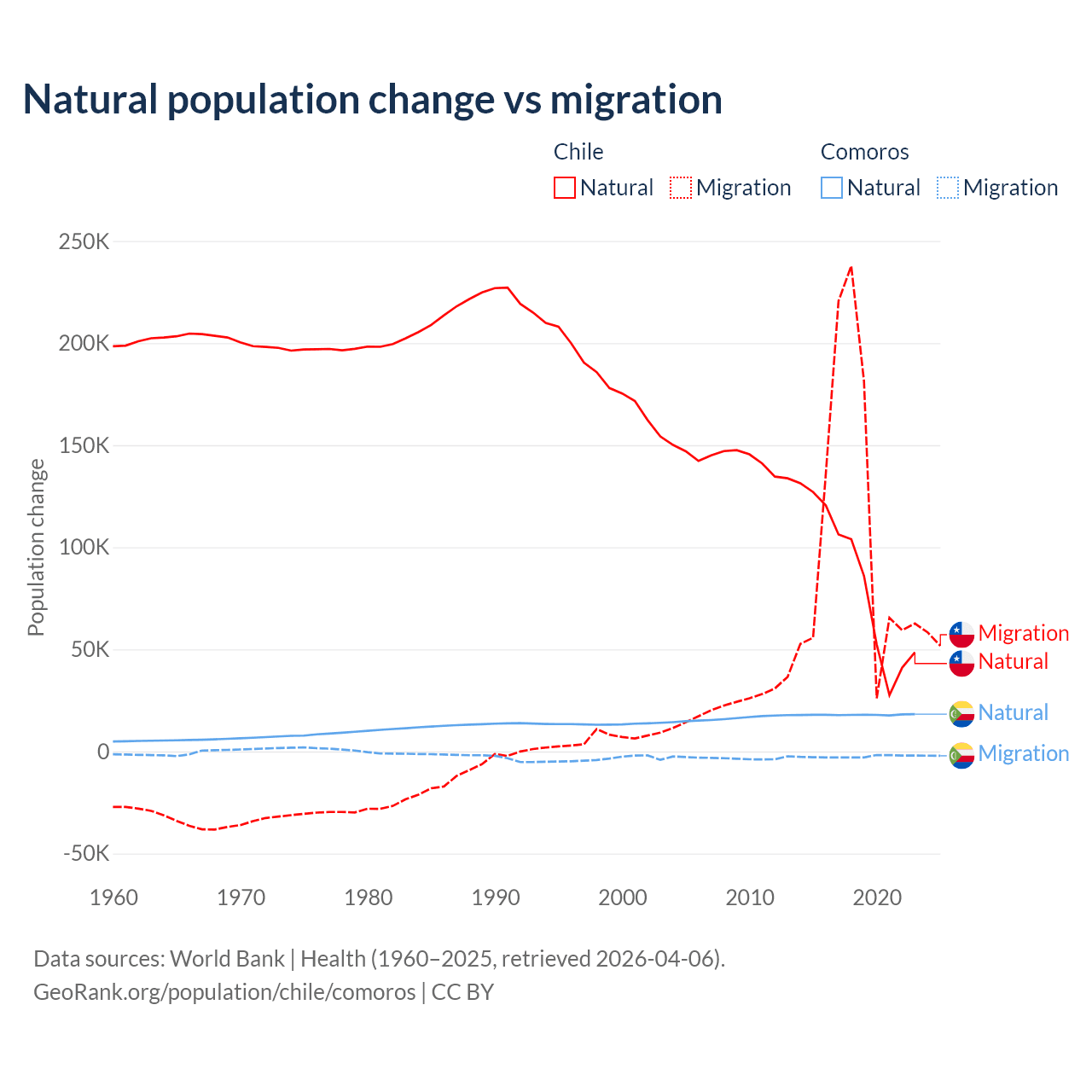 Over the last 10 years, 43.5% of the population change in Chile is from natural causes (a gain of 844,683 people) and 56.5% is from migration (a gain of 1,097,597 people). In Comoros 87.9% is from natural causes (a gain of 179,319 people) and 12.1% is from migration (a loss of 24,709 people).