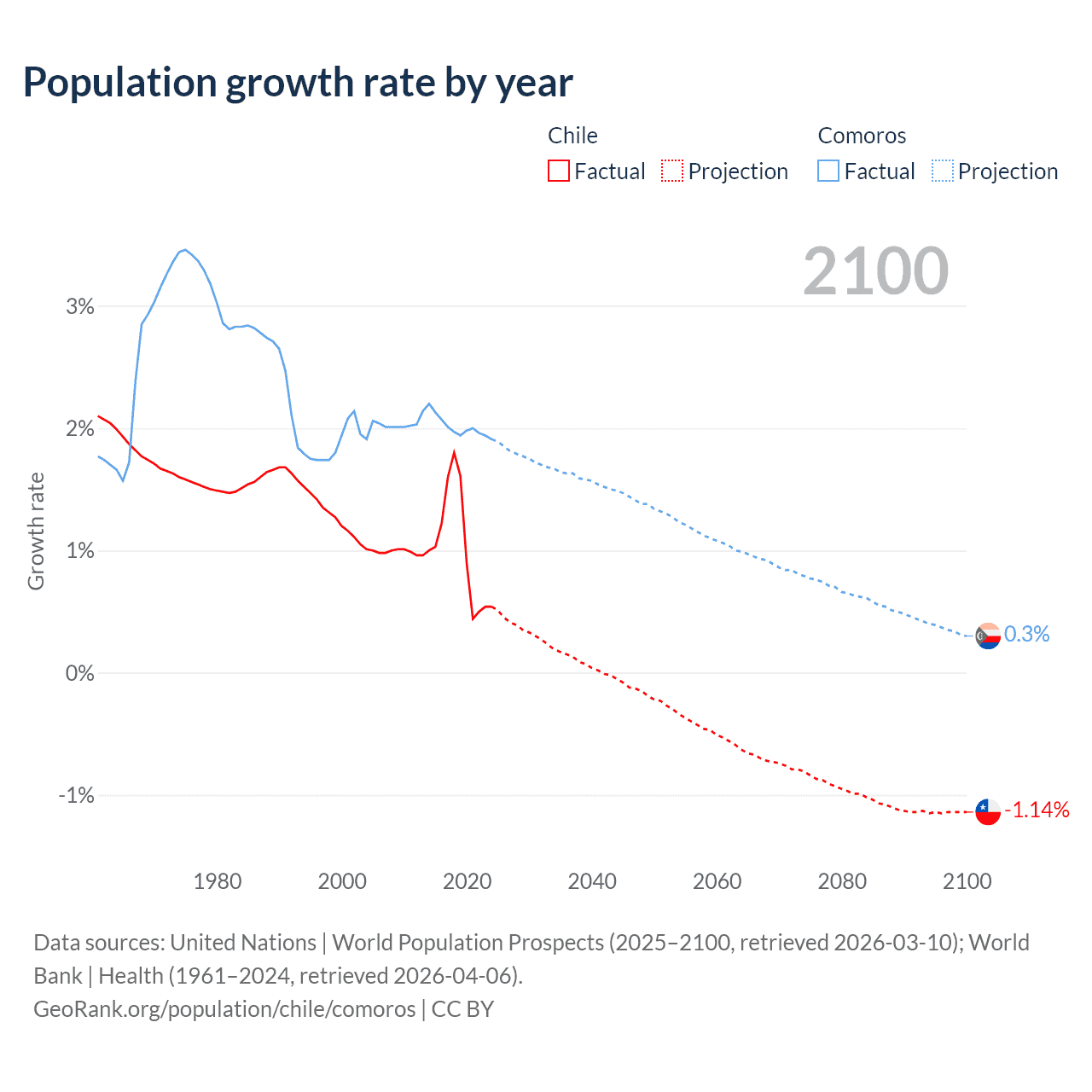 - For the last 10 years, Chile has had an average growth rate of +1.02% per year vs +2.01% in Comoros.