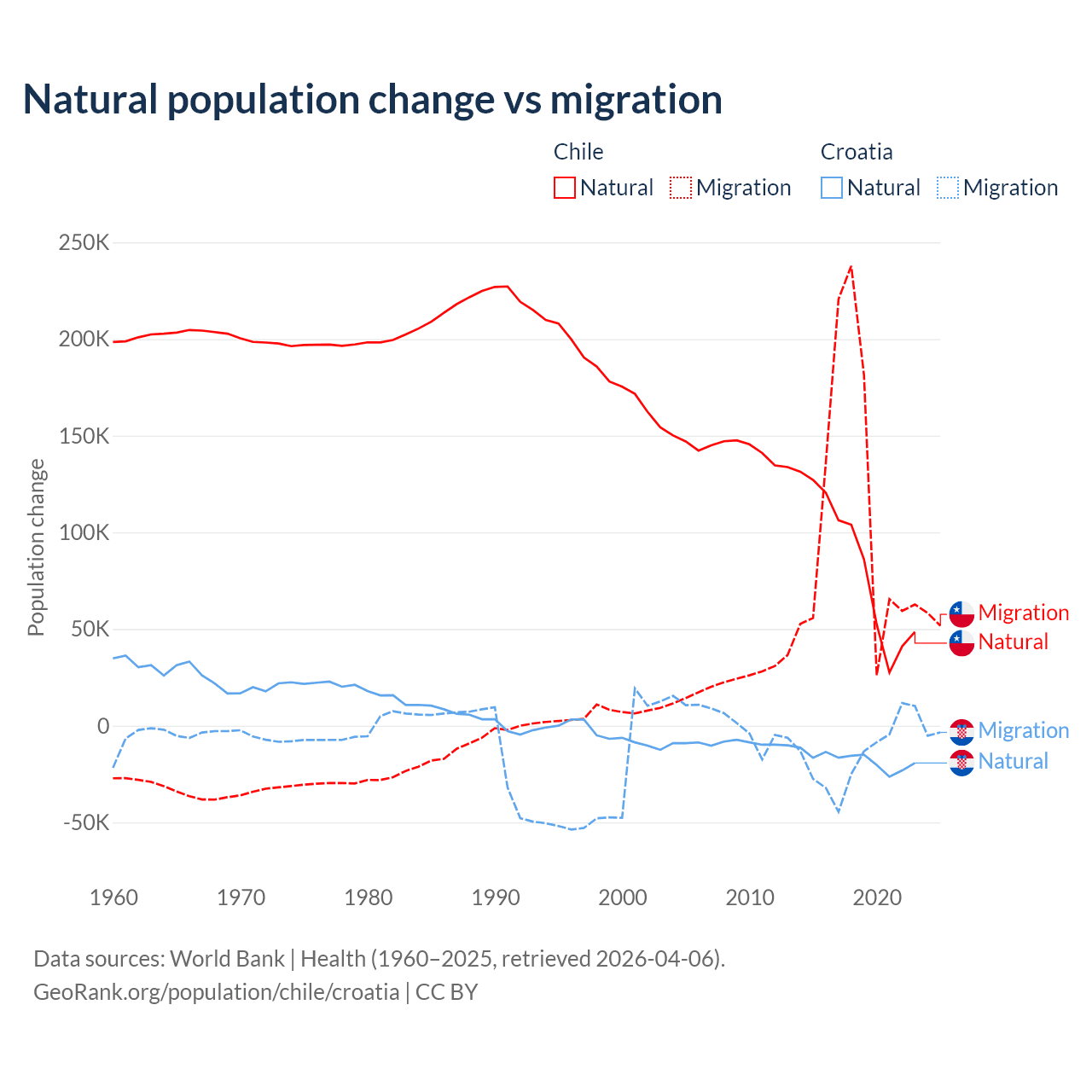 Over the last 10 years, 43.5% of the population change in Chile is from natural causes (a gain of 844,683 people) and 56.5% is from migration (a gain of 1,097,597 people). In Croatia 54.8% is from natural causes (a loss of 177,803 people) and 45.2% is from migration (a loss of 146,770 people).