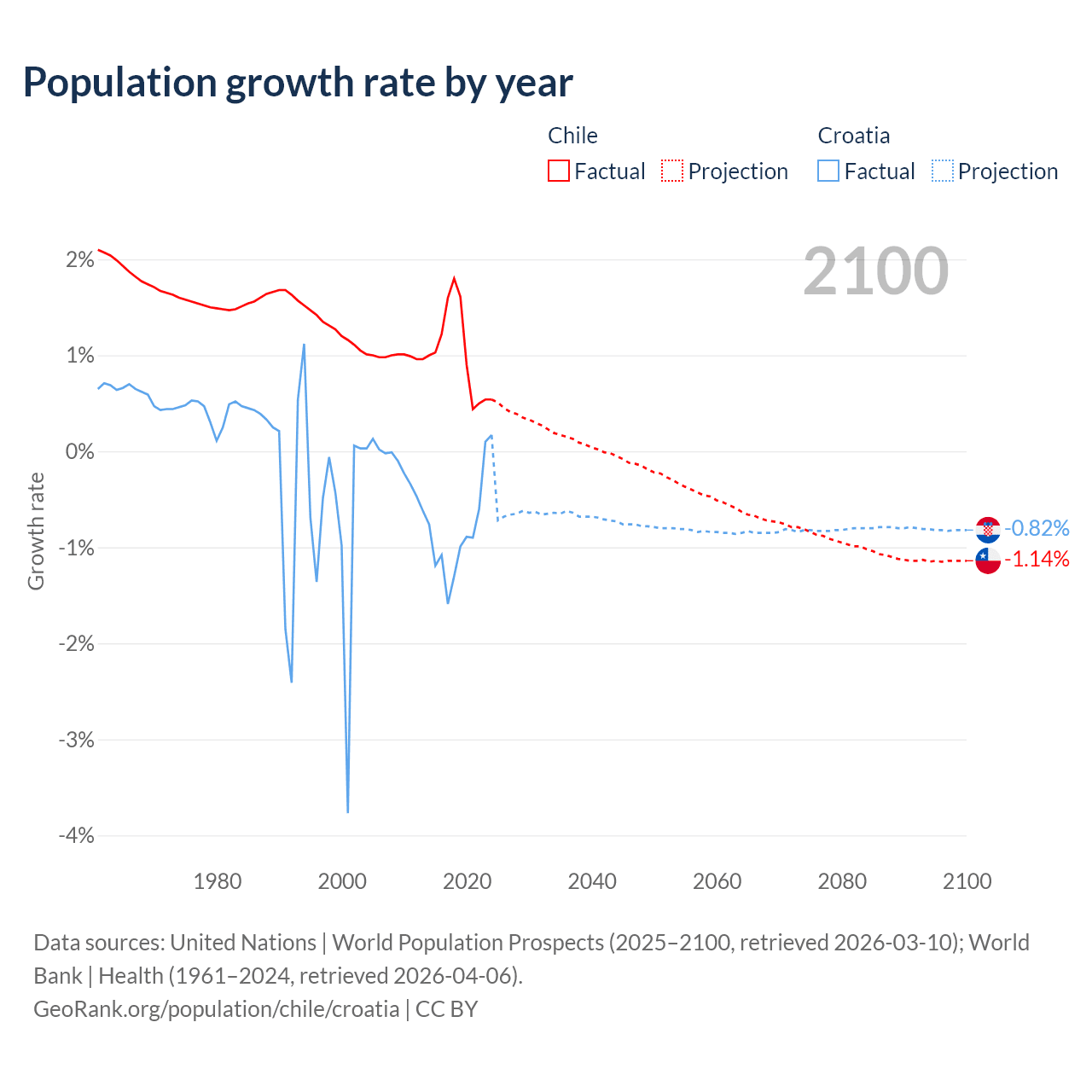 - For the last 10 years, Chile has had an average growth rate of +1.02% per year vs -0.82% in Croatia.