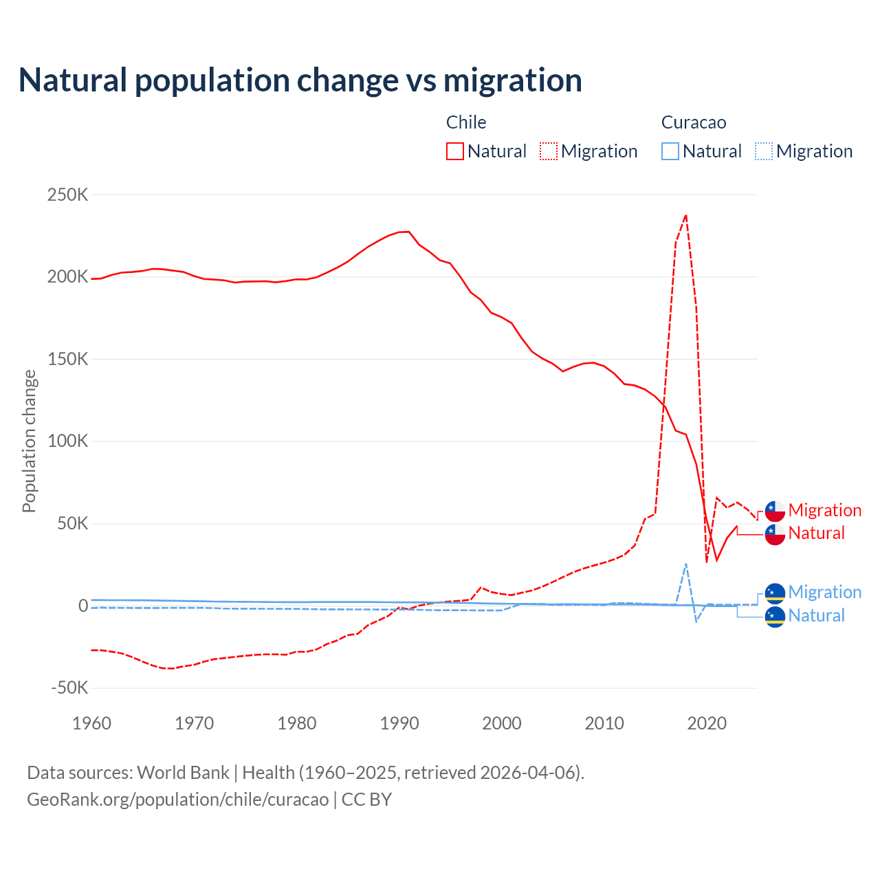 Over the last 10 years, 43.5% of the population change in Chile is from natural causes (a gain of 844,683 people) and 56.5% is from migration (a gain of 1,097,597 people). In Curacao 3.72% is from natural causes (a gain of 834 people) and 96.3% is from migration (a gain of 21,615 people).