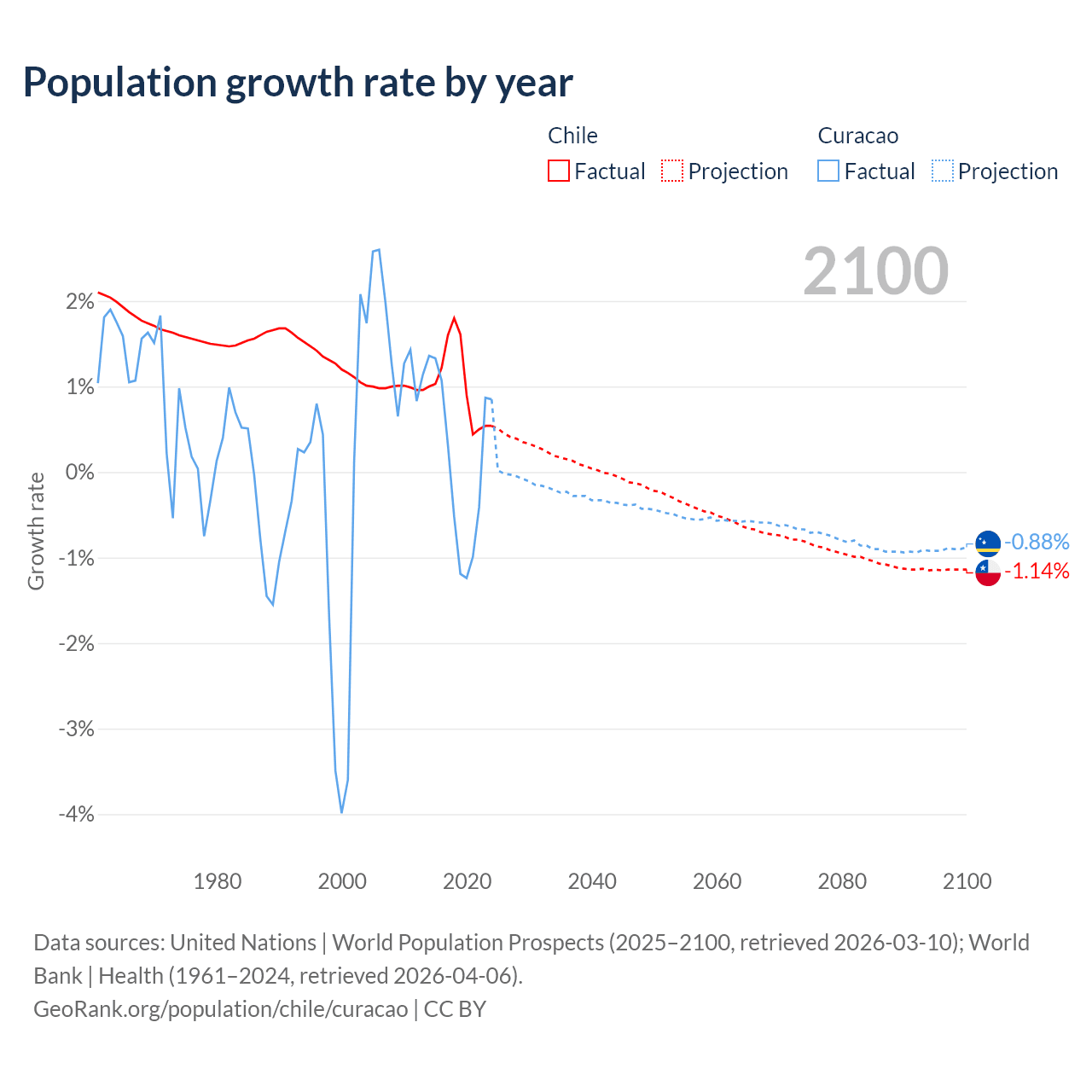- For the last 10 years, Chile has had an average growth rate of +1.02% per year vs +0.13% in Curacao.