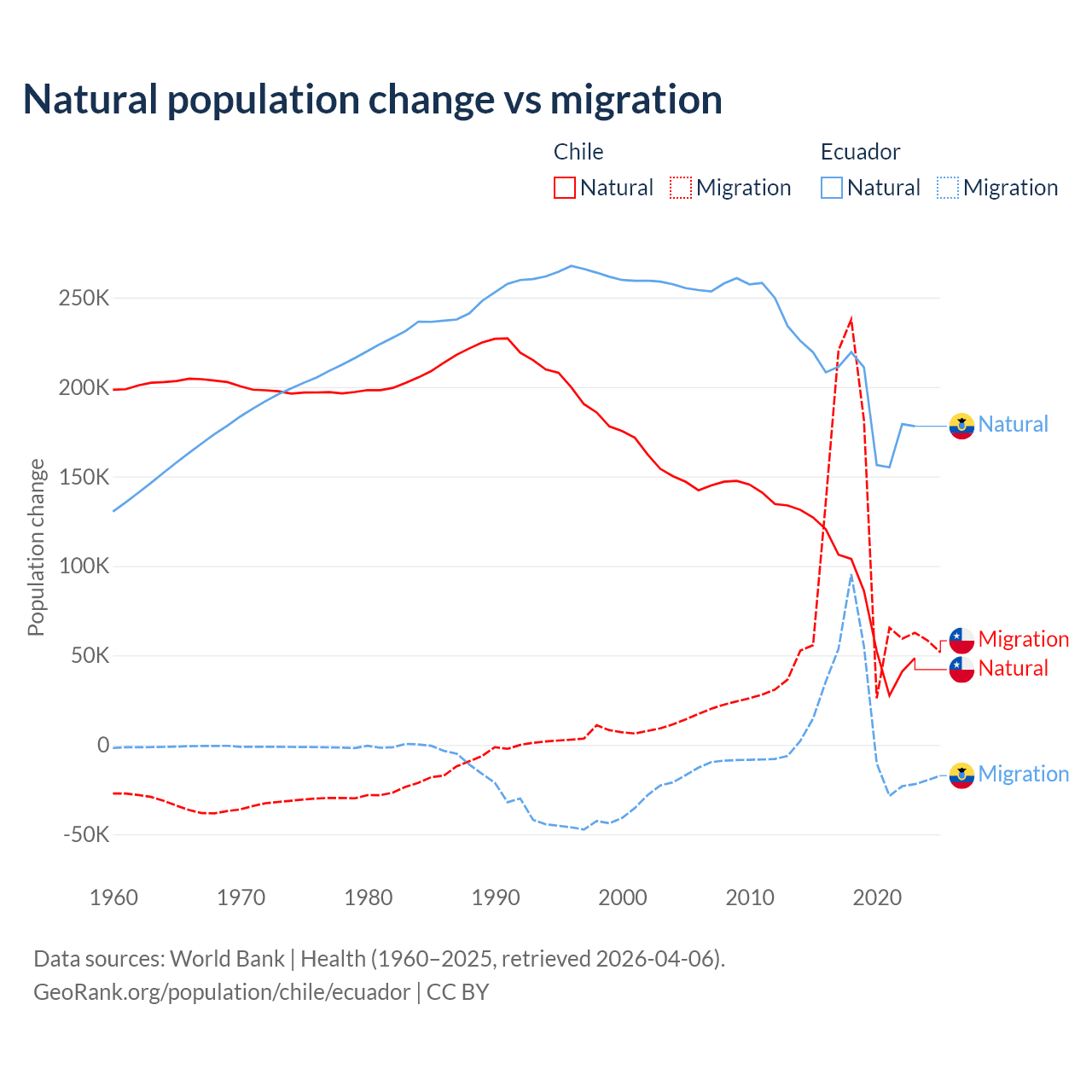 Over the last 10 years, 43.5% of the population change in Chile is from natural causes (a gain of 844,683 people) and 56.5% is from migration (a gain of 1,097,597 people). In Ecuador 91.9% is from natural causes (a gain of 1,964,352 people) and 8.08% is from migration (a gain of 172,707 people).