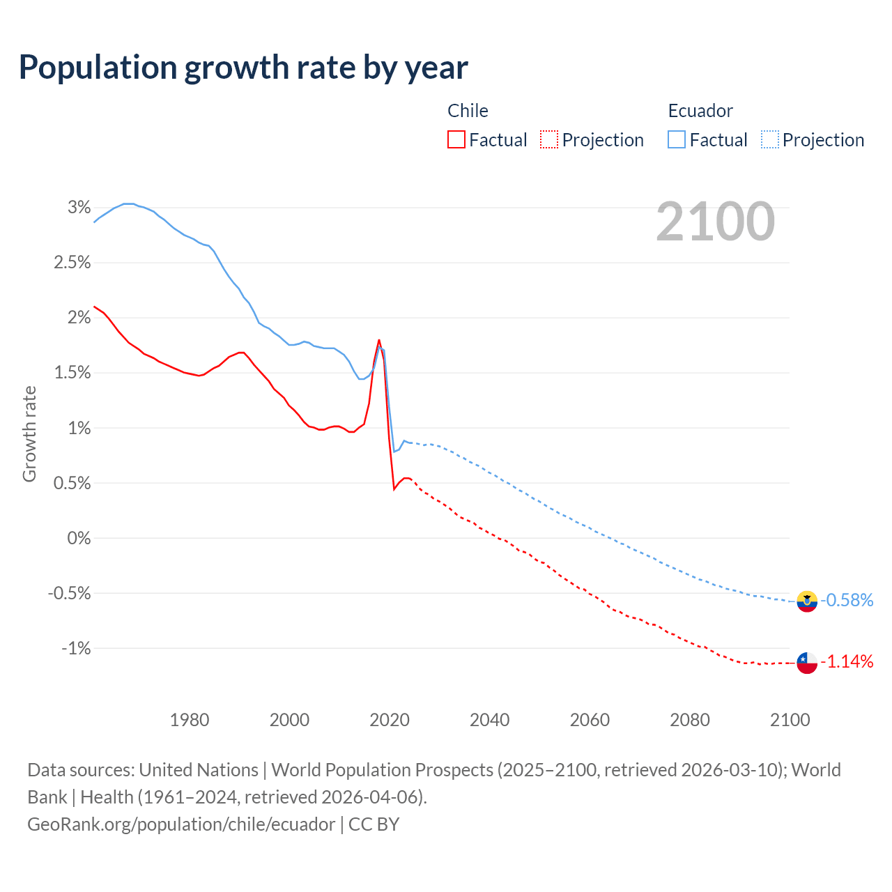 - For the last 10 years, Chile has had an average growth rate of +1.02% per year vs +1.26% in Ecuador.