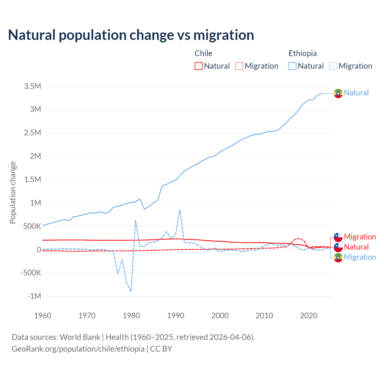 Over the last 10 years, 43.5% of the population change in Chile is from natural causes (a gain of 844,683 people) and 56.5% is from migration (a gain of 1,097,597 people). In Ethiopia 98.8% is from natural causes (a gain of 30,237,373 people) and 1.19% is from migration (a gain of 365,488 people).