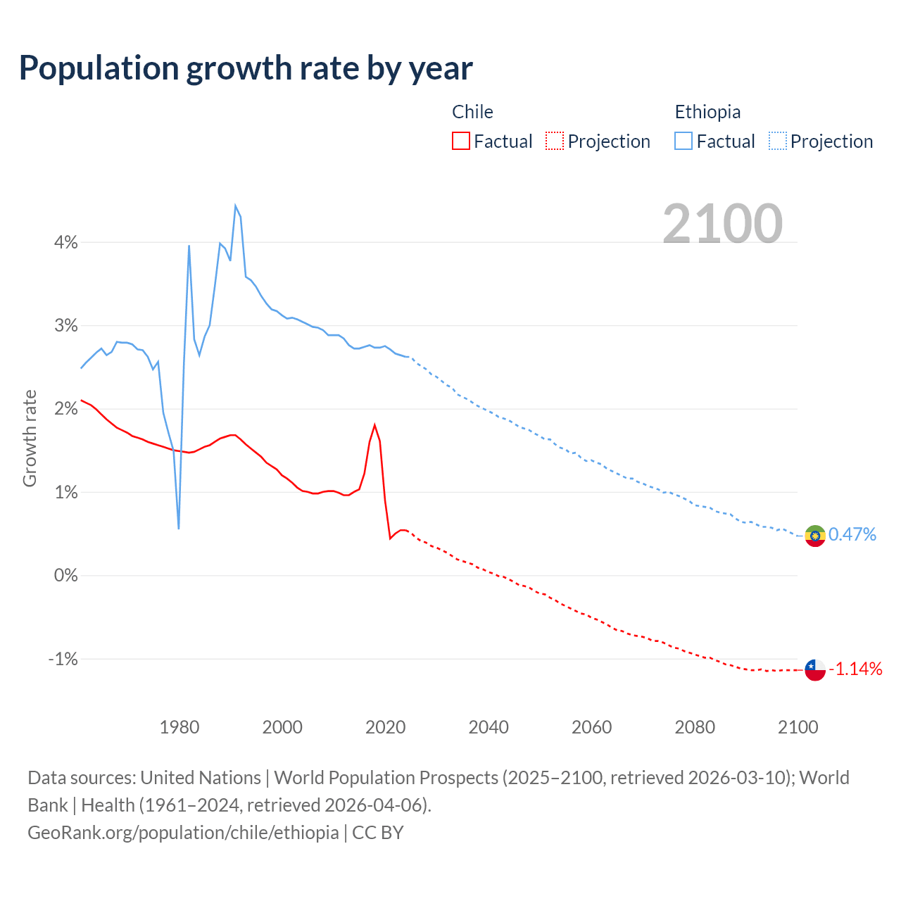 - For the last 10 years, Chile has had an average growth rate of +1.02% per year vs +2.71% in Ethiopia.