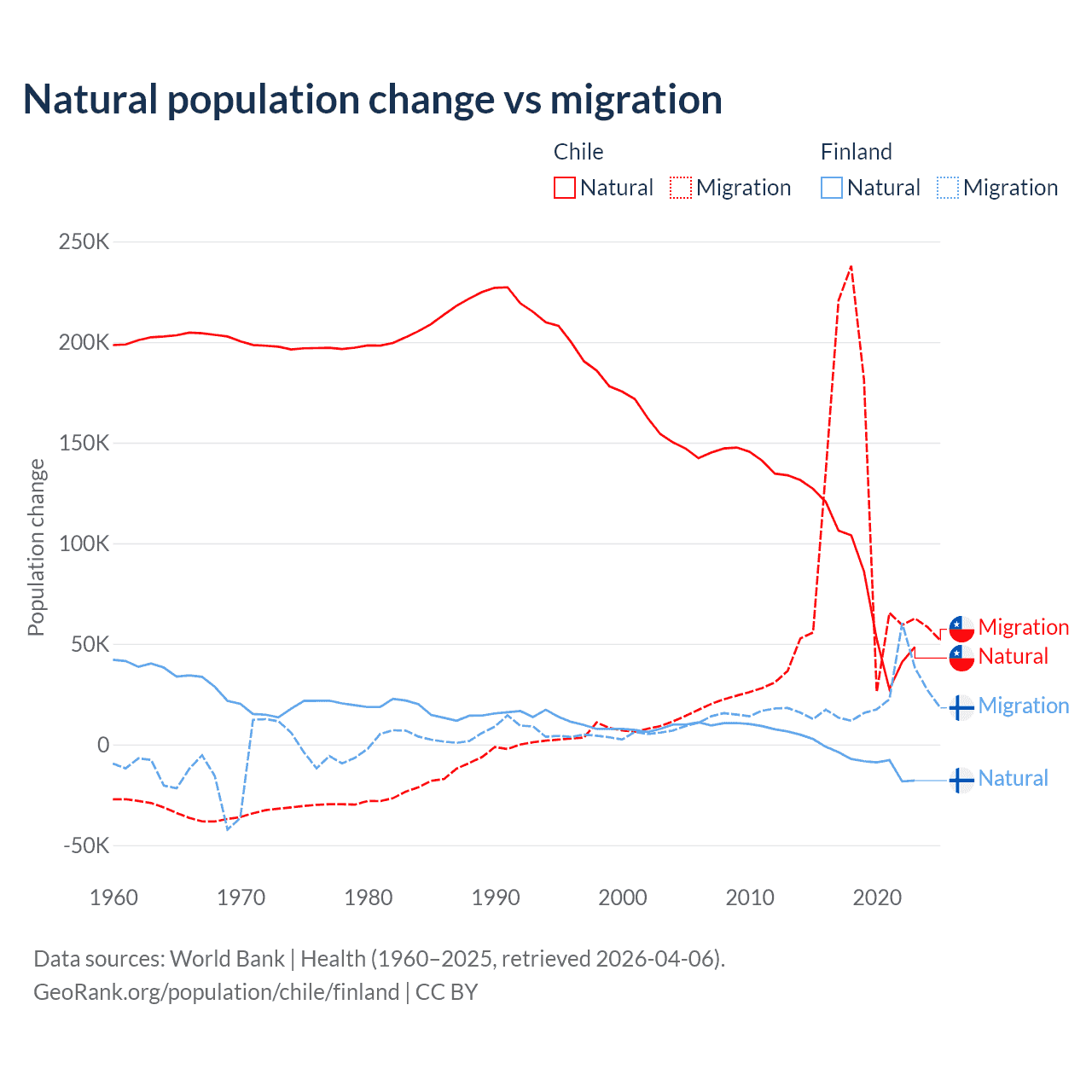 Over the last 10 years, 43.5% of the population change in Chile is from natural causes (a gain of 844,683 people) and 56.5% is from migration (a gain of 1,097,597 people). In Finland 22.5% is from natural causes (a loss of 65,560 people) and 77.5% is from migration (a gain of 225,237 people).