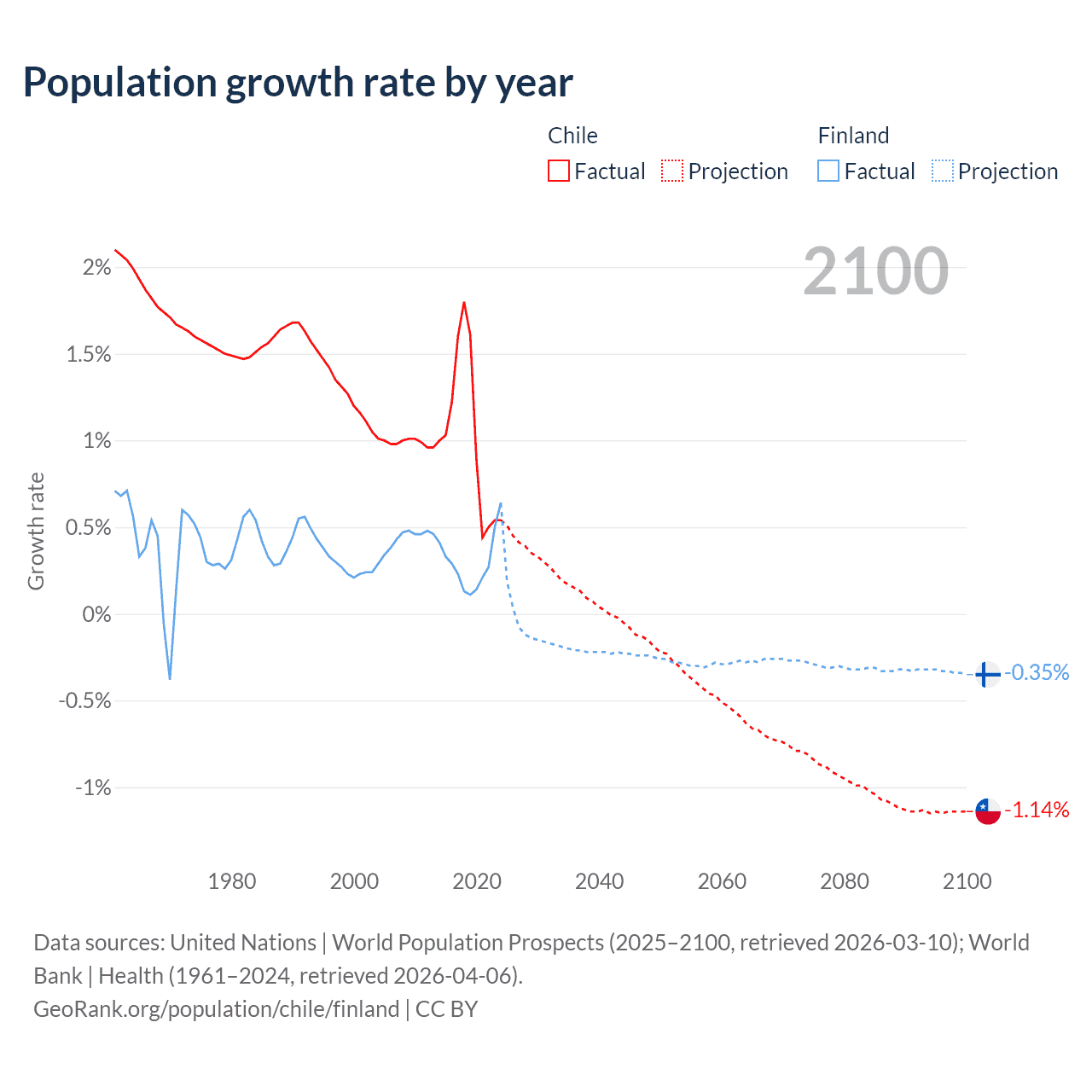 - For the last 10 years, Chile has had an average growth rate of +1.02% per year vs +0.3% in Finland.