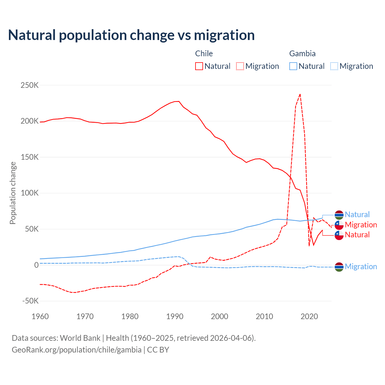 Over the last 10 years, 43.5% of the population change in Chile is from natural causes (a gain of 844,683 people) and 56.5% is from migration (a gain of 1,097,597 people). In the Gambia 95.2% is from natural causes (a gain of 625,795 people) and 4.75% is from migration (a loss of 31,227 people).