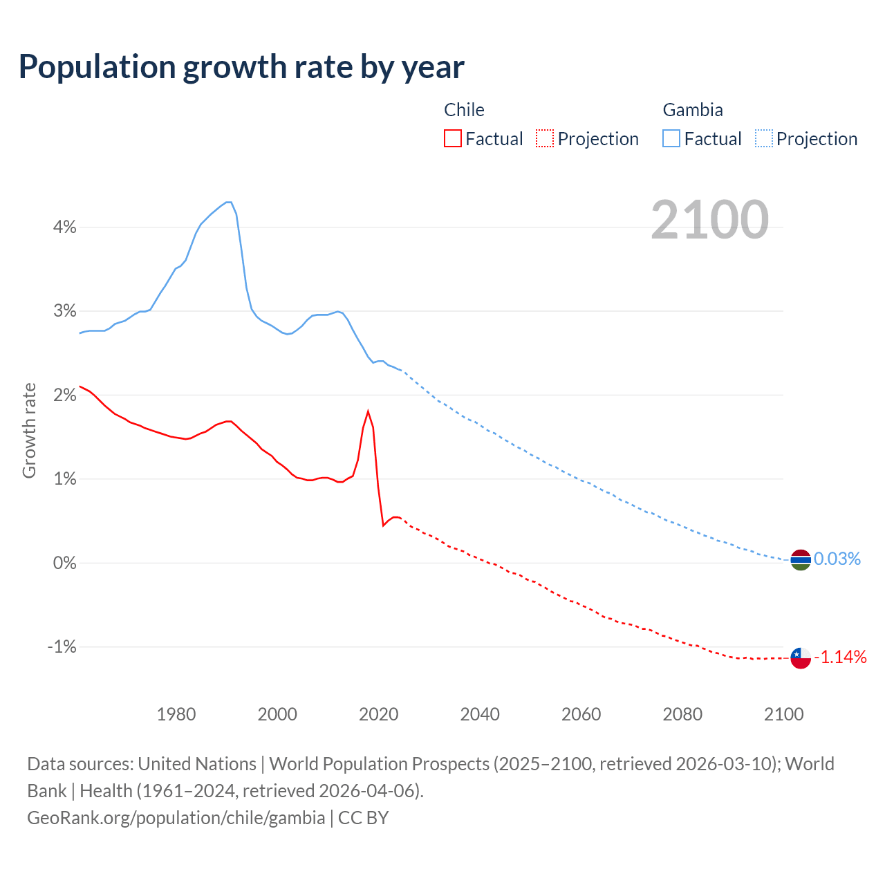 - For the last 10 years, Chile has had an average growth rate of +1.02% per year vs +2.5% in the Gambia.