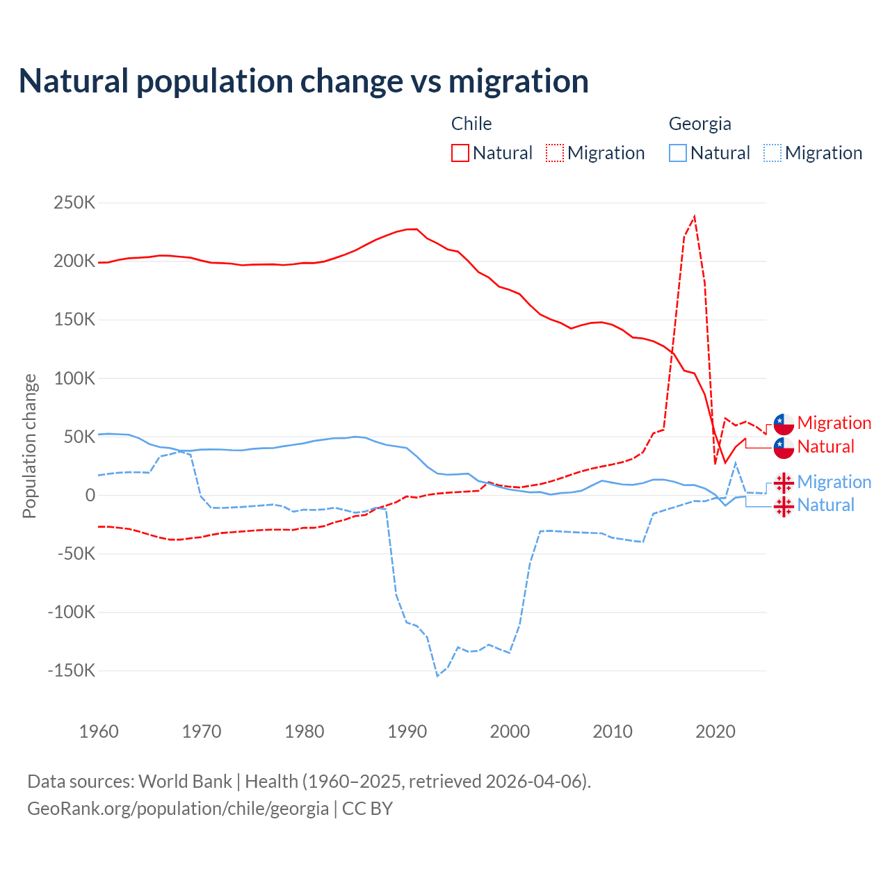 Over the last 10 years, 43.5% of the population change in Chile is from natural causes (a gain of 844,683 people) and 56.5% is from migration (a gain of 1,097,597 people). In Georgia 57.7% is from natural causes (a gain of 47,646 people) and 42.3% is from migration (a loss of 34,907 people).