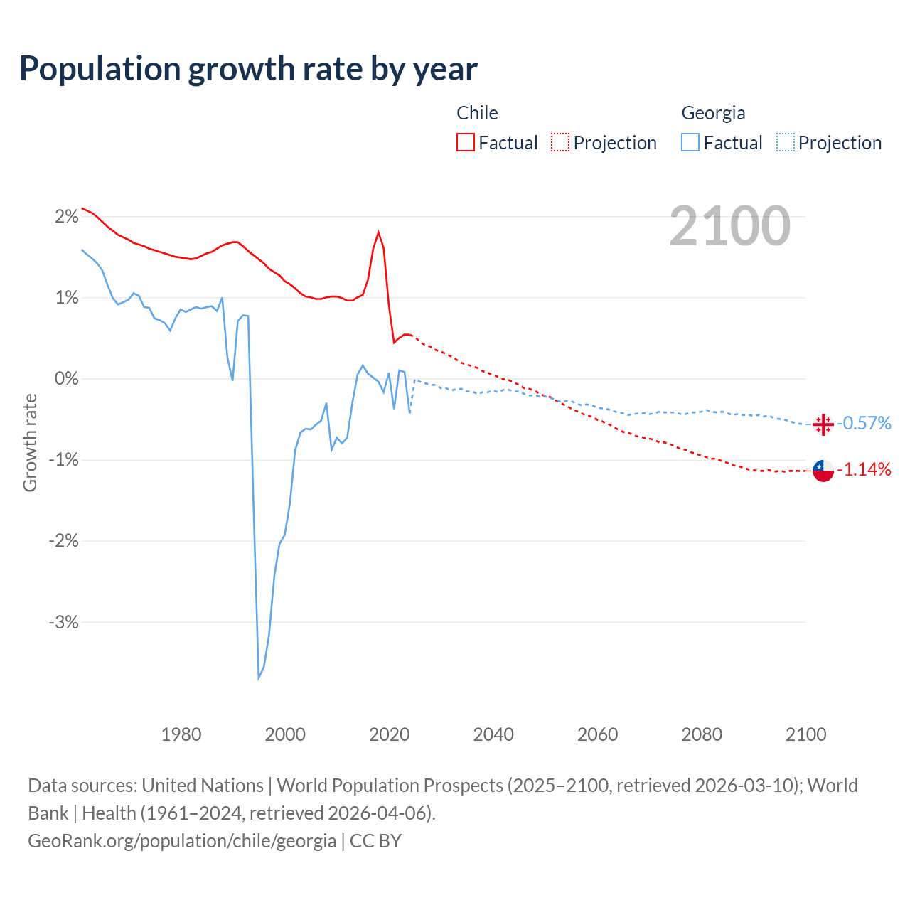 - For the last 10 years, Chile has had an average growth rate of +1.02% per year vs -0.04% in Georgia.