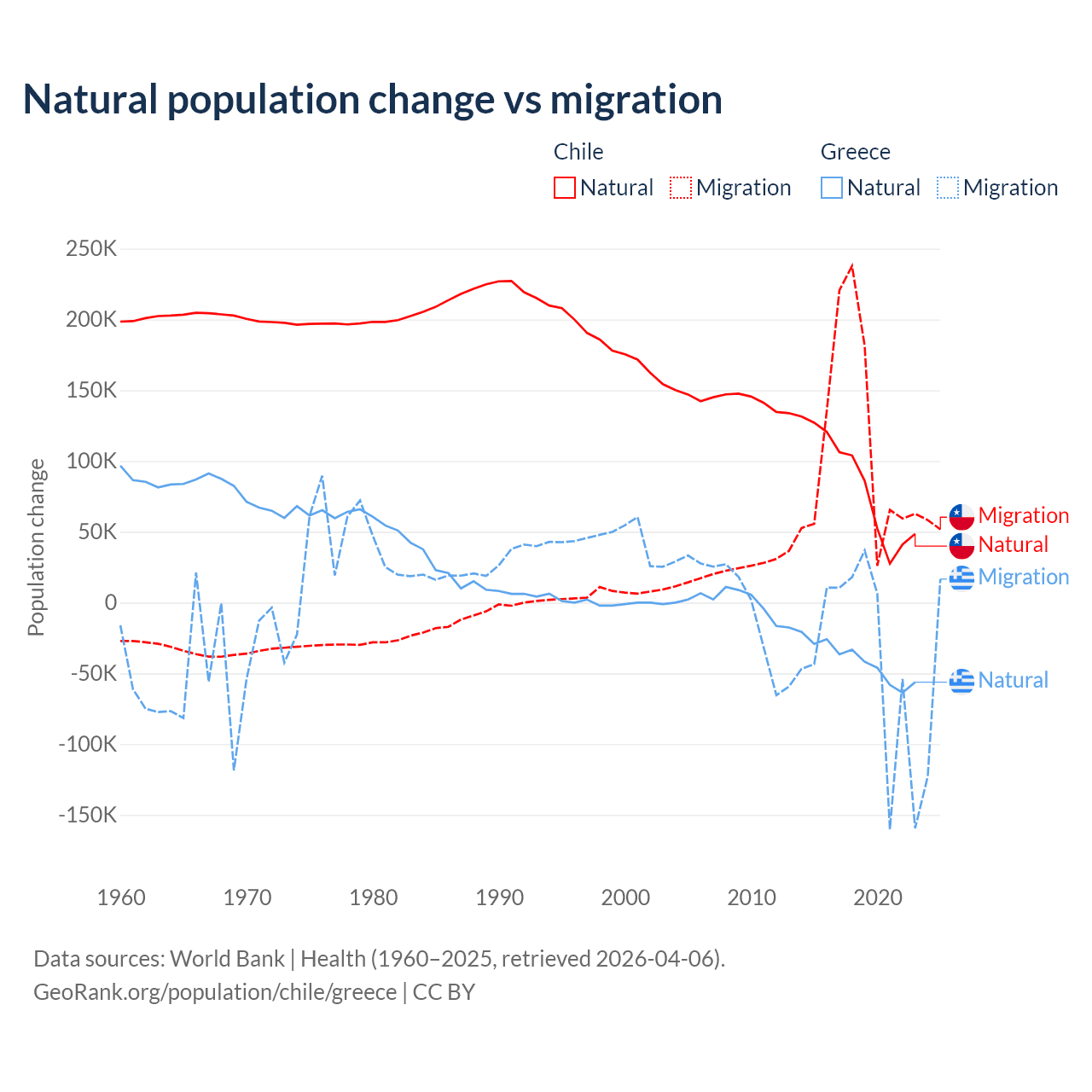 Over the last 10 years, 43.5% of the population change in Chile is from natural causes (a gain of 844,683 people) and 56.5% is from migration (a gain of 1,097,597 people). In Greece 51.9% is from natural causes (a loss of 411,426 people) and 48.1% is from migration (a loss of 381,824 people).