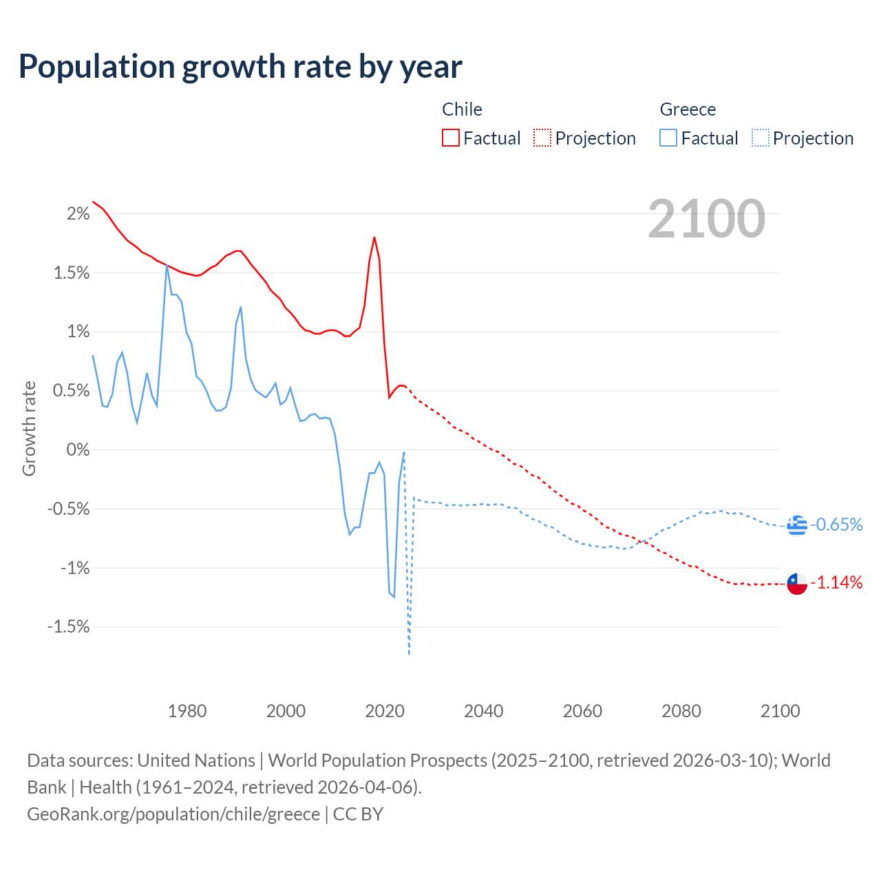 - For the last 10 years, Chile has had an average growth rate of +1.02% per year vs -0.47% in Greece.