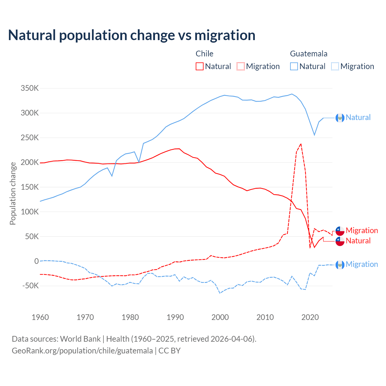Over the last 10 years, 43.5% of the population change in Chile is from natural causes (a gain of 844,683 people) and 56.5% is from migration (a gain of 1,097,597 people). In Guatemala 89.8% is from natural causes (a gain of 3,077,847 people) and 10.2% is from migration (a loss of 347,818 people).