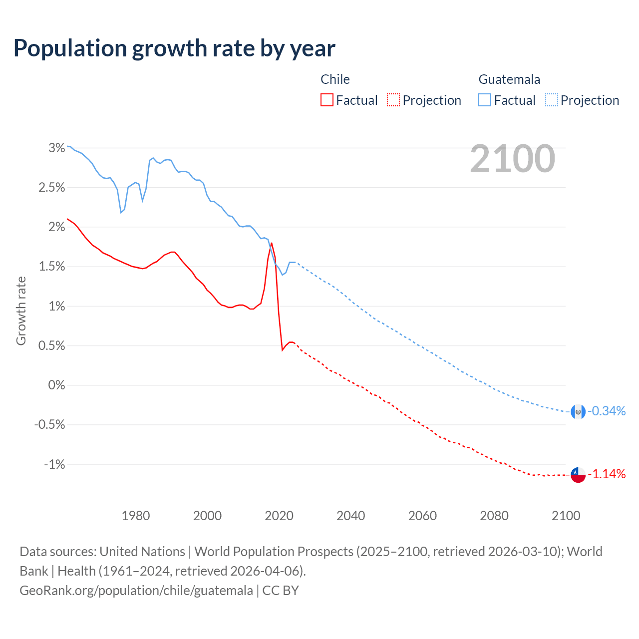 - For the last 10 years, Chile has had an average growth rate of +1.02% per year vs +1.64% in Guatemala.