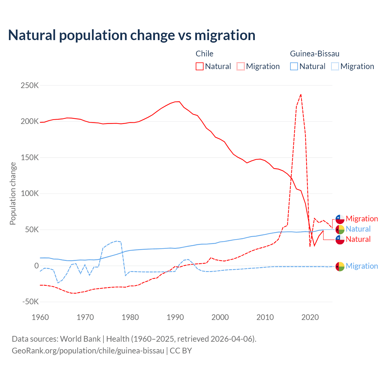 Over the last 10 years, 43.5% of the population change in Chile is from natural causes (a gain of 844,683 people) and 56.5% is from migration (a gain of 1,097,597 people). In Guinea-Bissau 97.1% is from natural causes (a gain of 472,826 people) and 2.87% is from migration (a loss of 13,956 people).