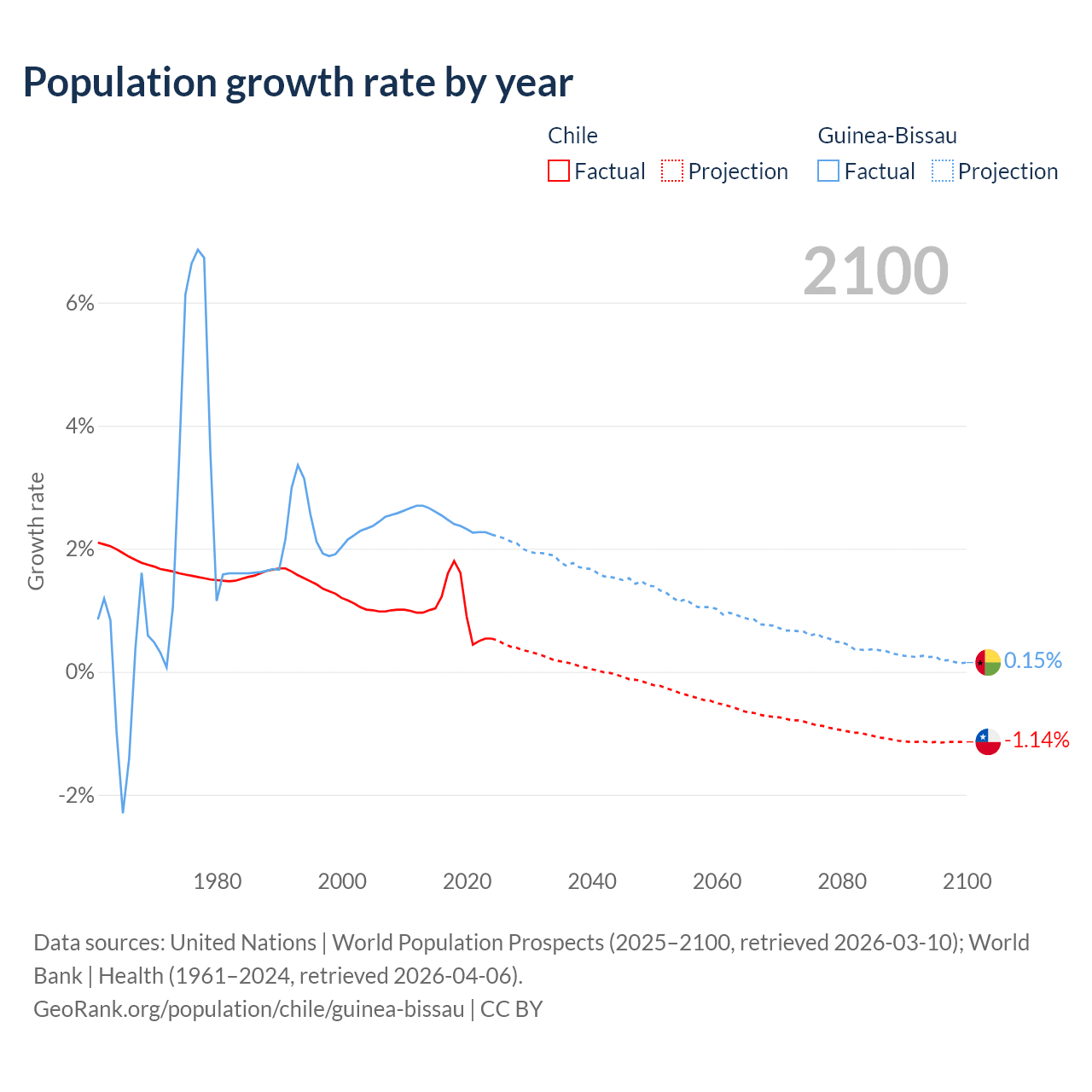 - For the last 10 years, Chile has had an average growth rate of +1.02% per year vs +2.4% in Guinea-Bissau.