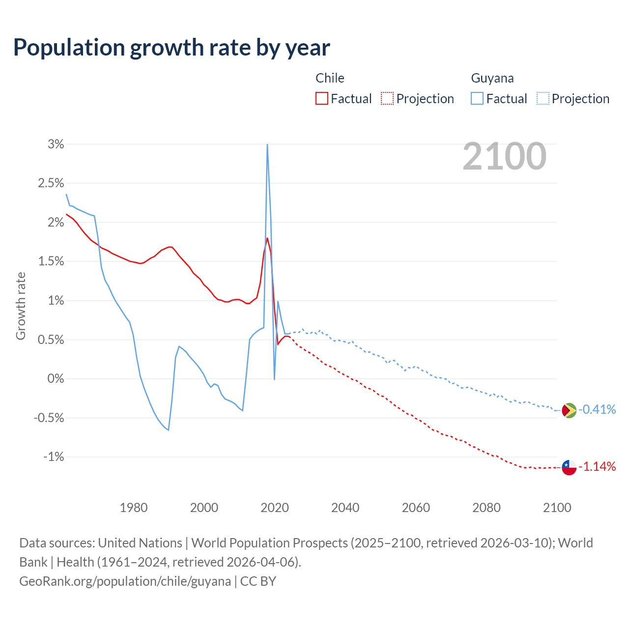 - For the last 10 years, Chile has had an average growth rate of +1.02% per year vs +0.94% in Guyana.