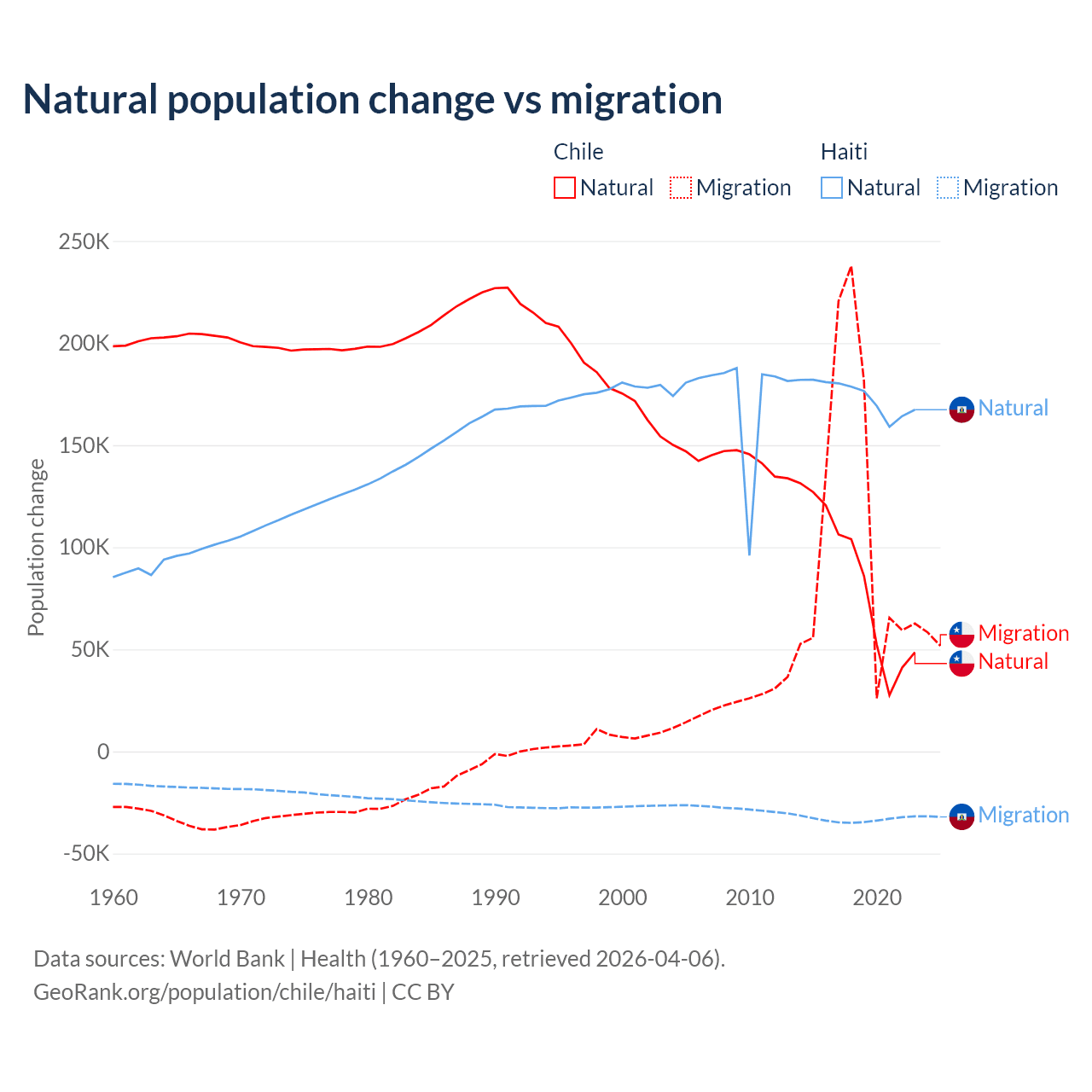 Over the last 10 years, 43.5% of the population change in Chile is from natural causes (a gain of 844,683 people) and 56.5% is from migration (a gain of 1,097,597 people). In Haiti 83.9% is from natural causes (a gain of 1,740,319 people) and 16.1% is from migration (a loss of 333,076 people).
