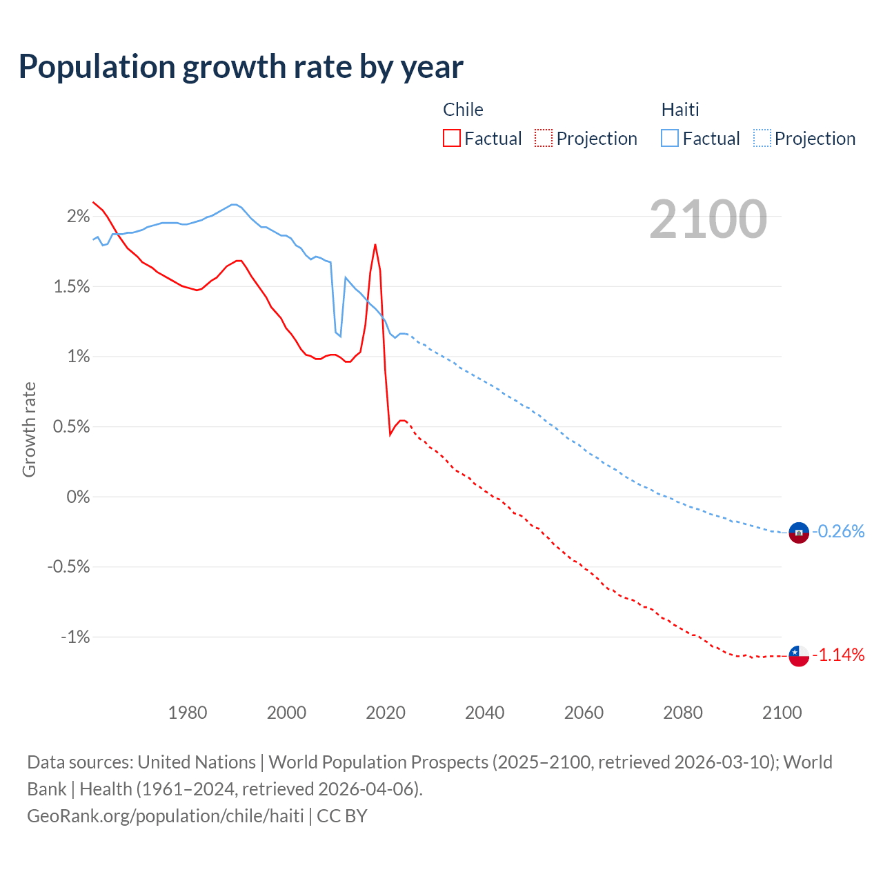 - For the last 10 years, Chile has had an average growth rate of +1.02% per year vs +1.29% in Haiti.