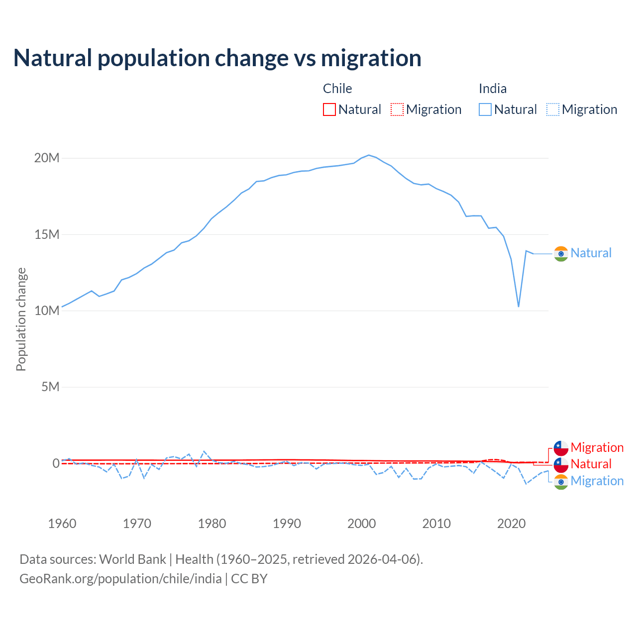 Over the last 10 years, 43.5% of the population change in Chile is from natural causes (a gain of 844,683 people) and 56.5% is from migration (a gain of 1,097,597 people). In India 96.4% is from natural causes (a gain of 145,503,378 people) and 3.56% is from migration (a loss of 5,376,884 people).