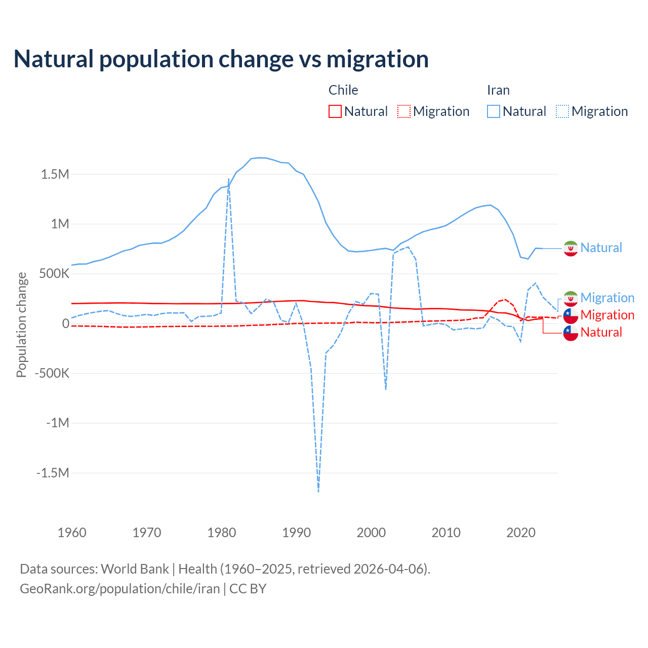 Over the last 10 years, 43.5% of the population change in Chile is from natural causes (a gain of 844,683 people) and 56.5% is from migration (a gain of 1,097,597 people). In Iran 92.5% is from natural causes (a gain of 9,405,860 people) and 7.46% is from migration (a gain of 757,979 people).