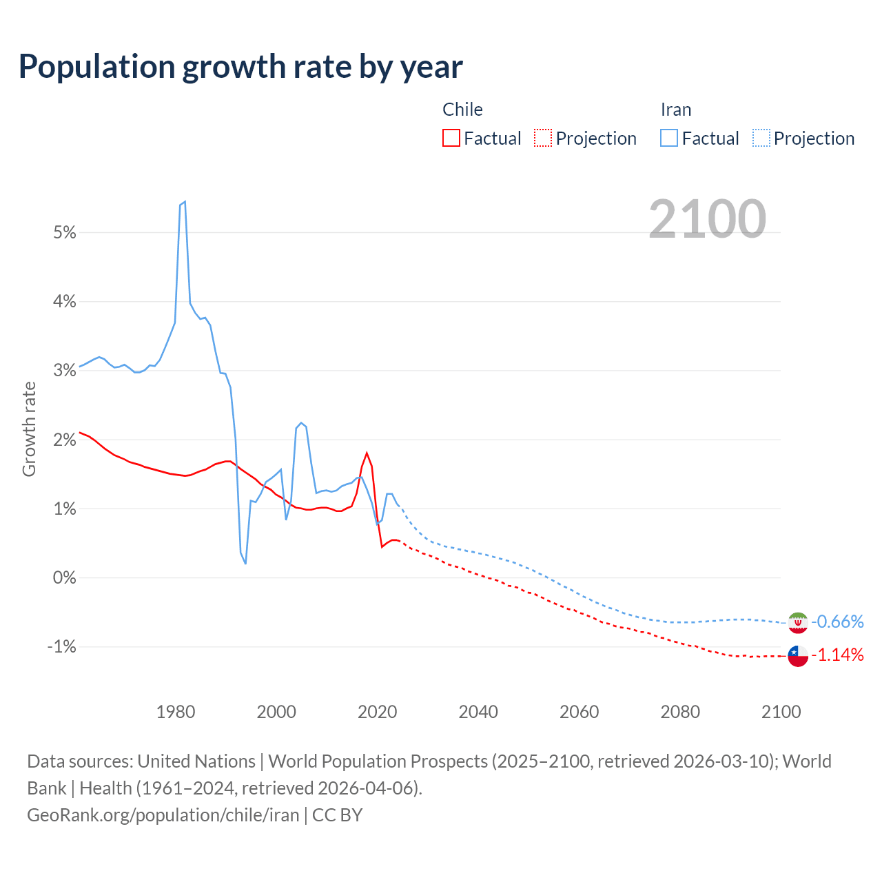 - For the last 10 years, Chile has had an average growth rate of +1.02% per year vs +1.19% in Iran.
