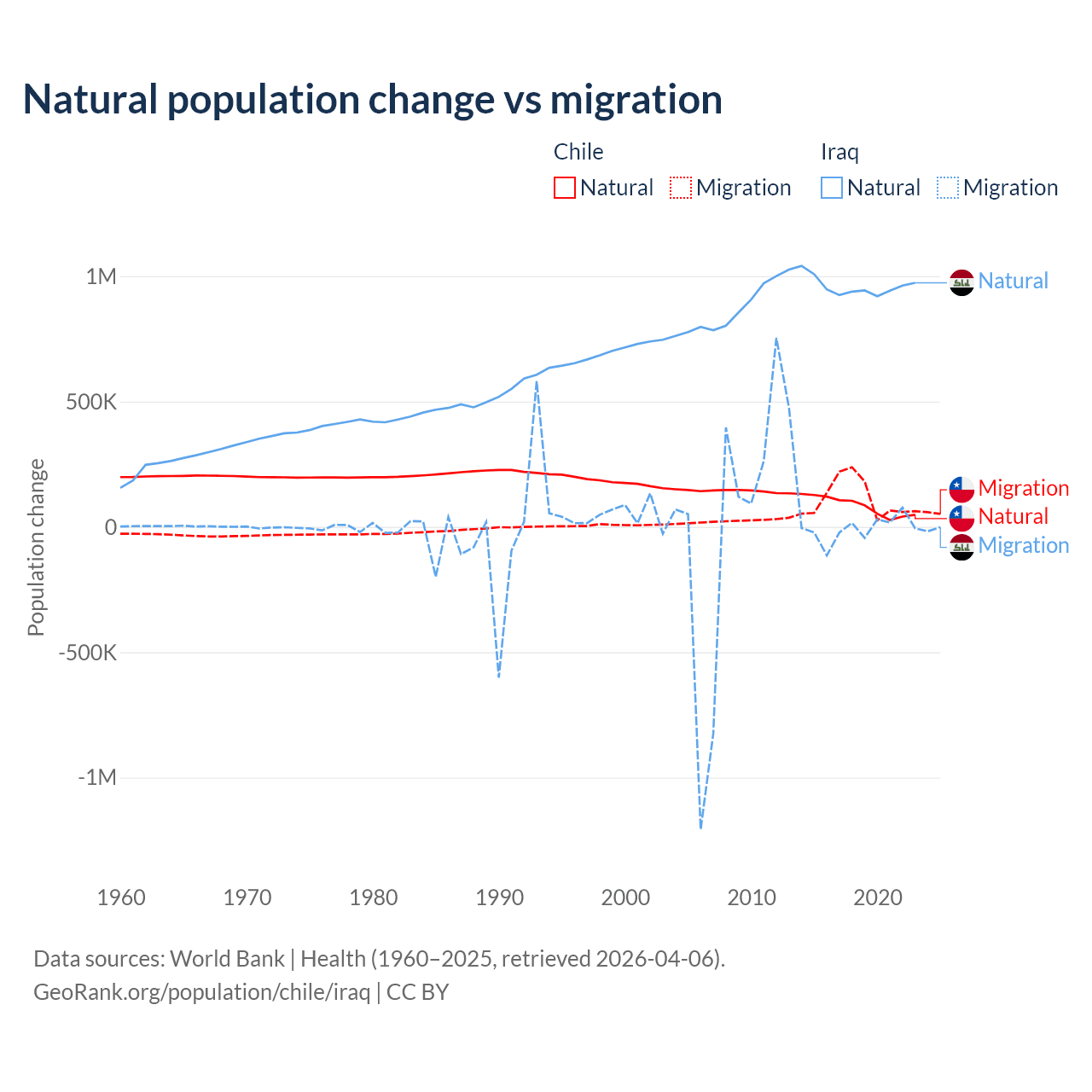 Over the last 10 years, 43.5% of the population change in Chile is from natural causes (a gain of 844,683 people) and 56.5% is from migration (a gain of 1,097,597 people). In Iraq 99.2% is from natural causes (a gain of 9,598,842 people) and 0.76% is from migration (a loss of 73,050 people).