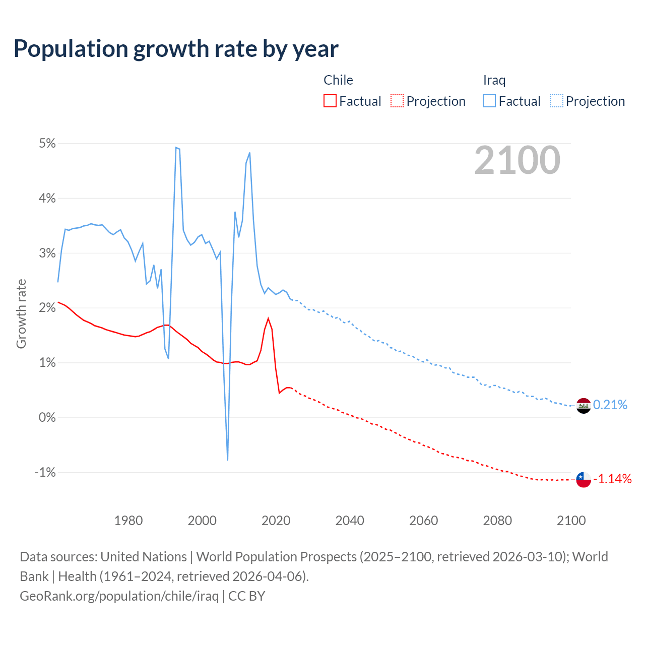 - For the last 10 years, Chile has had an average growth rate of +1.02% per year vs +2.45% in Iraq.