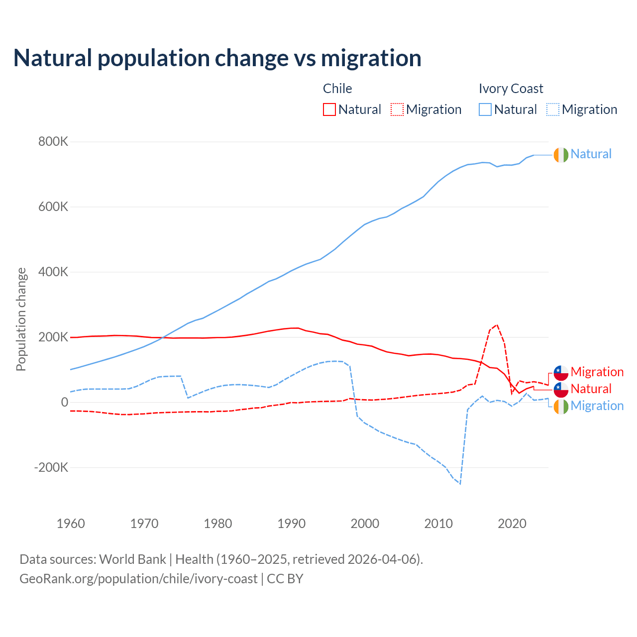Over the last 10 years, 43.5% of the population change in Chile is from natural causes (a gain of 844,683 people) and 56.5% is from migration (a gain of 1,097,597 people). In Ivory Coast 99.7% is from natural causes (a gain of 7,348,944 people) and 0.33% is from migration (a gain of 24,432 people).