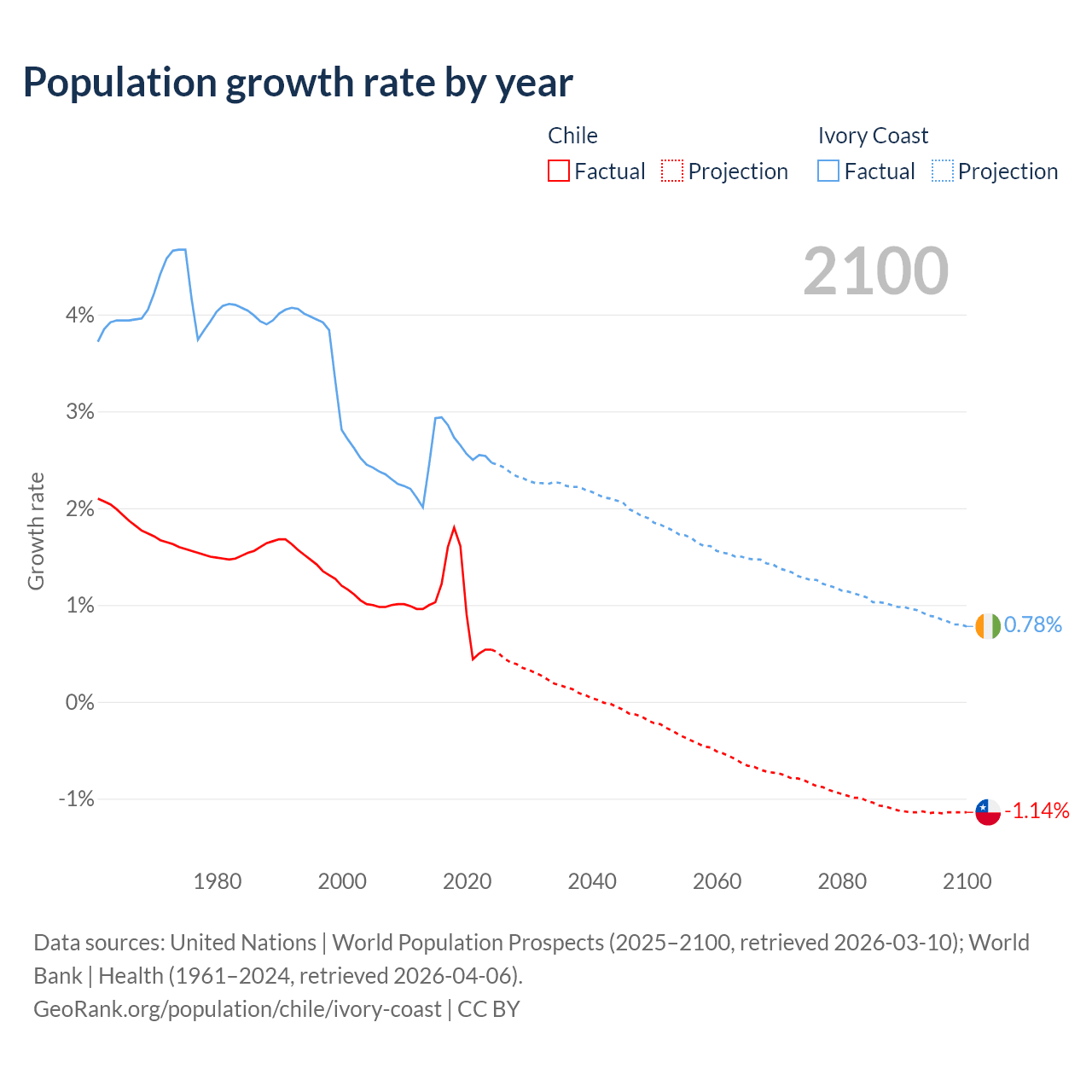 - For the last 10 years, Chile has had an average growth rate of +1.02% per year vs +2.65% in Ivory Coast.