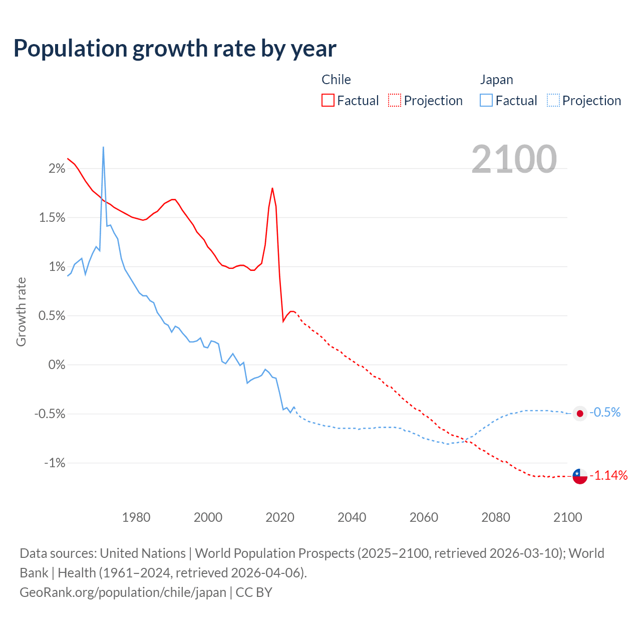 - For the last 10 years, Chile has had an average growth rate of +1.02% per year vs -0.25% in Japan.