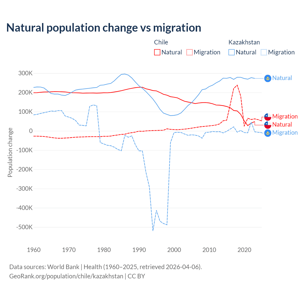 Over the last 10 years, 43.5% of the population change in Chile is from natural causes (a gain of 844,683 people) and 56.5% is from migration (a gain of 1,097,597 people). In Kazakhstan 98.7% is from natural causes (a gain of 2,743,094 people) and 1.33% is from migration (a gain of 36,908 people).