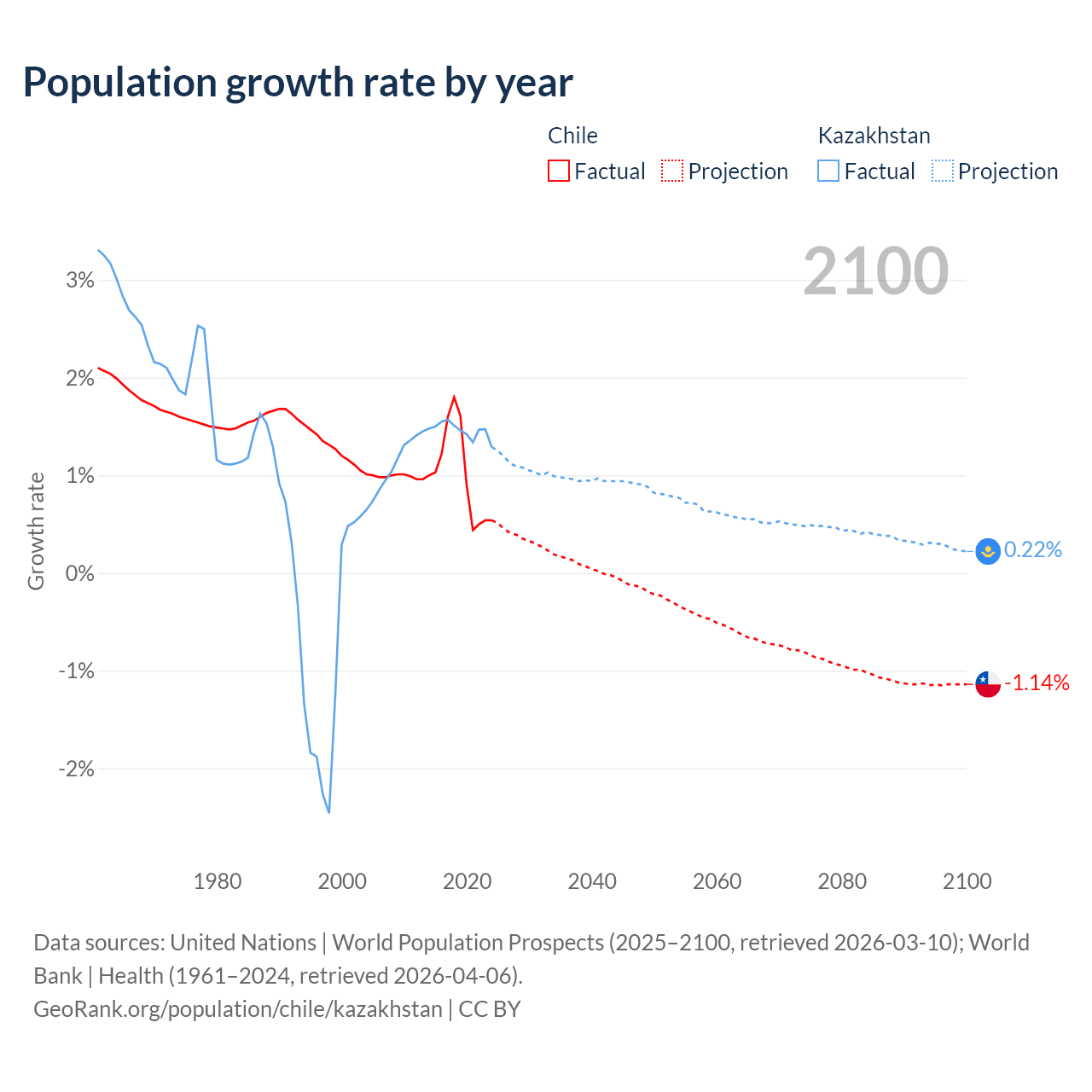 - For the last 10 years, Chile has had an average growth rate of +1.02% per year vs +1.46% in Kazakhstan.