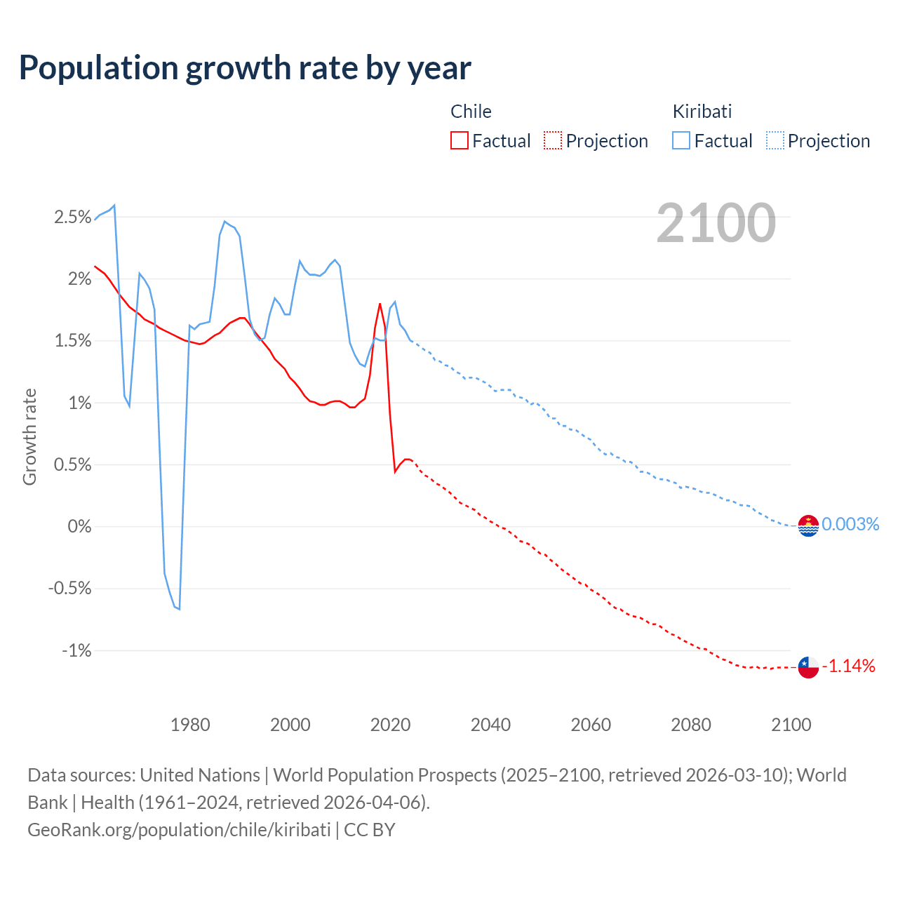 - For the last 10 years, Chile has had an average growth rate of +1.02% per year vs +1.53% in Kiribati.