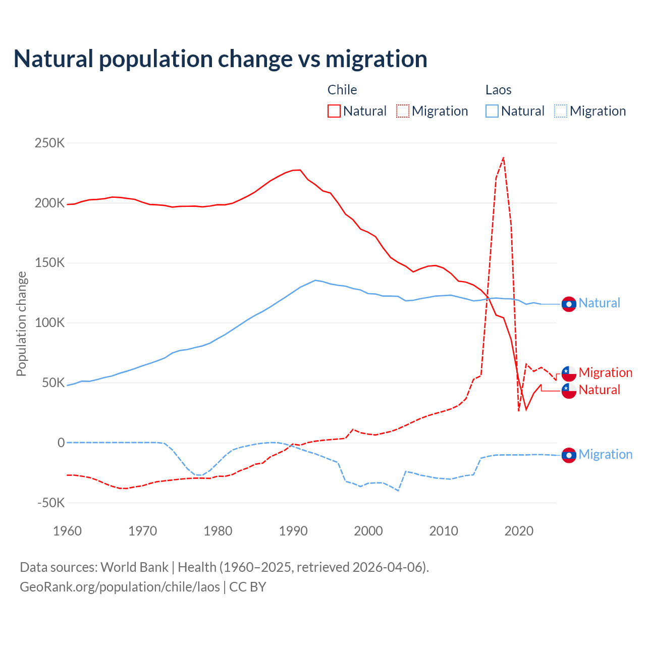 Over the last 10 years, 43.5% of the population change in Chile is from natural causes (a gain of 844,683 people) and 56.5% is from migration (a gain of 1,097,597 people). In Laos 90.6% is from natural causes (a gain of 1,183,013 people) and 9.41% is from migration (a loss of 122,899 people).