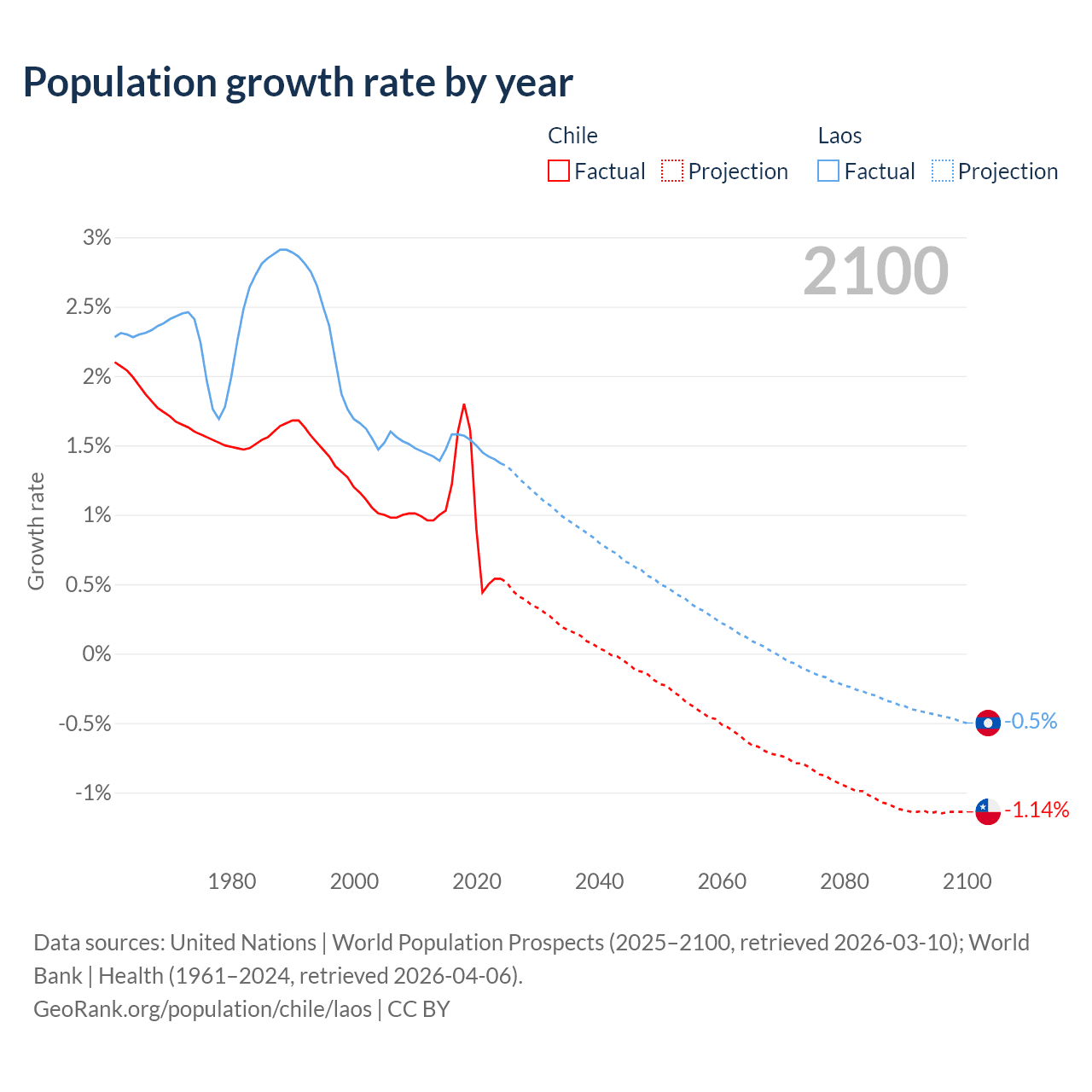 - For the last 10 years, Chile has had an average growth rate of +1.02% per year vs +1.48% in Laos.
