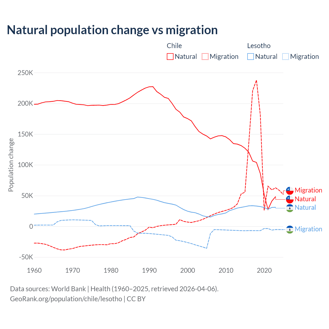 Over the last 10 years, 43.5% of the population change in Chile is from natural causes (a gain of 844,683 people) and 56.5% is from migration (a gain of 1,097,597 people). In Lesotho 84.2% is from natural causes (a gain of 315,836 people) and 15.8% is from migration (a loss of 59,457 people).